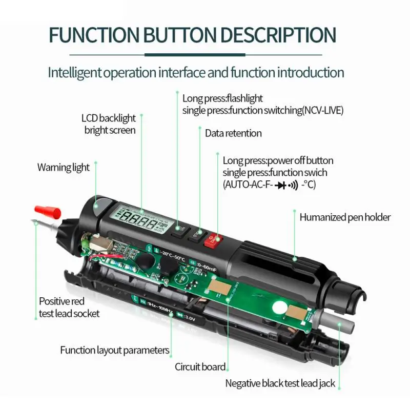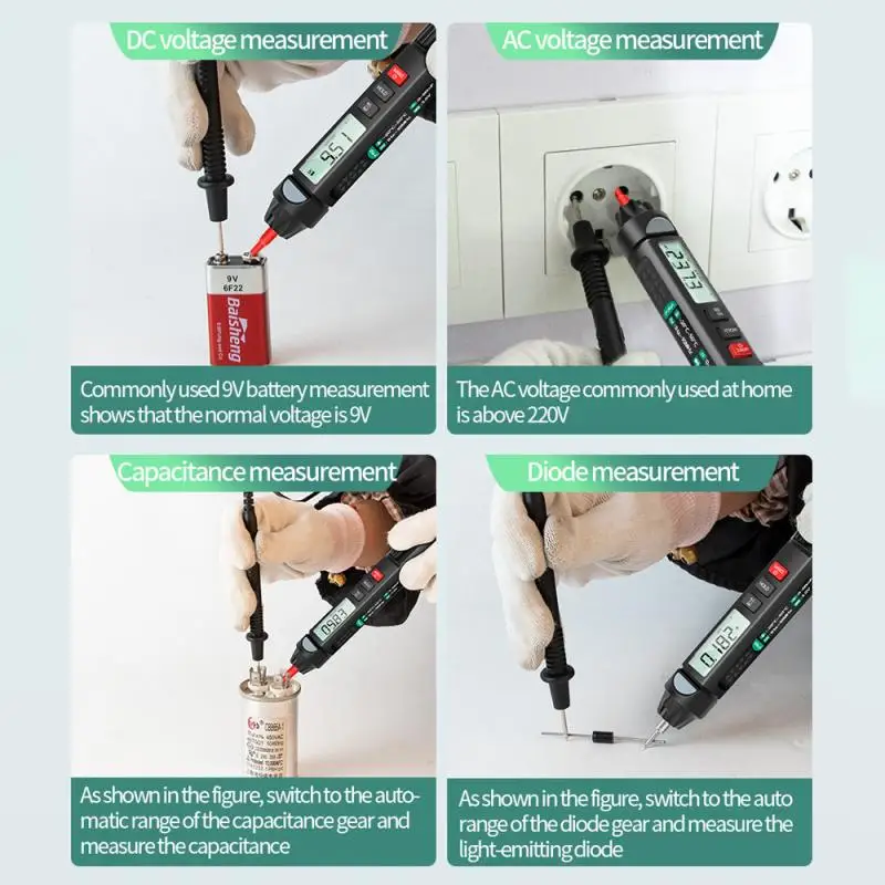 Универсальный перьевой мультиметр: Этот мультиметр отличается тестированием сопротивления/емкости/диода/частоты/температуры, непрерывности, нулевой линии и бесконтактного определения напряжения и т. д.