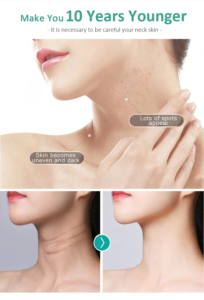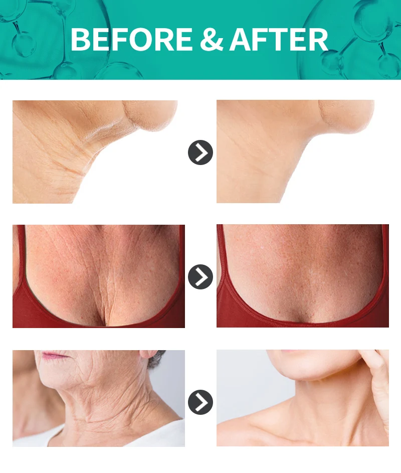 Для всех типов кожи и всех возрастов, идеально подходит для тех, кто чувствует признаки старения, такие как сухость, потеря упругости и креповая кожа. Используйте для разглаживания шеи и декольте, уменьшая появление тонких линий и морщин, улучшает эластичность кожи, гладкость и увлажнение, чтобы уменьшить внешний вид горизонтальных линий на шее.