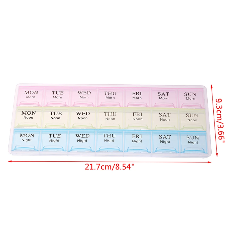 Этот красочный чехол для таблеток позволит вам увидеть на первый взгляд, какой из них вам нужно использовать сегодня. Дизайн цвета радуги делает вашу жизнь более яркой. В общей сложности семь коробок, каждая коробка делится на три небольших коробки. Таким образом, есть 21 сетка, достаточно для использования в течение недели.Спецификация:Цвет: РадужныйРазмер: как показано на фотографииМатериал: пластик