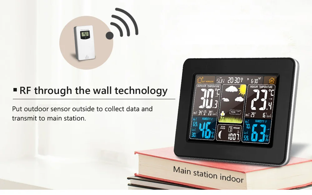 4. Внутренняя/наружная температура и влажность (℃ или ℉). Диапазон измерения температуры в помещении: -10 ℃ ~ 50 ℃, Диапазон измерения температуры на открытом воздухе: -20 ℃ ~ 50 ℃, диапазон измерения влажности в помещении и на открытом воздухе: 20% RH ~ 95% RH.