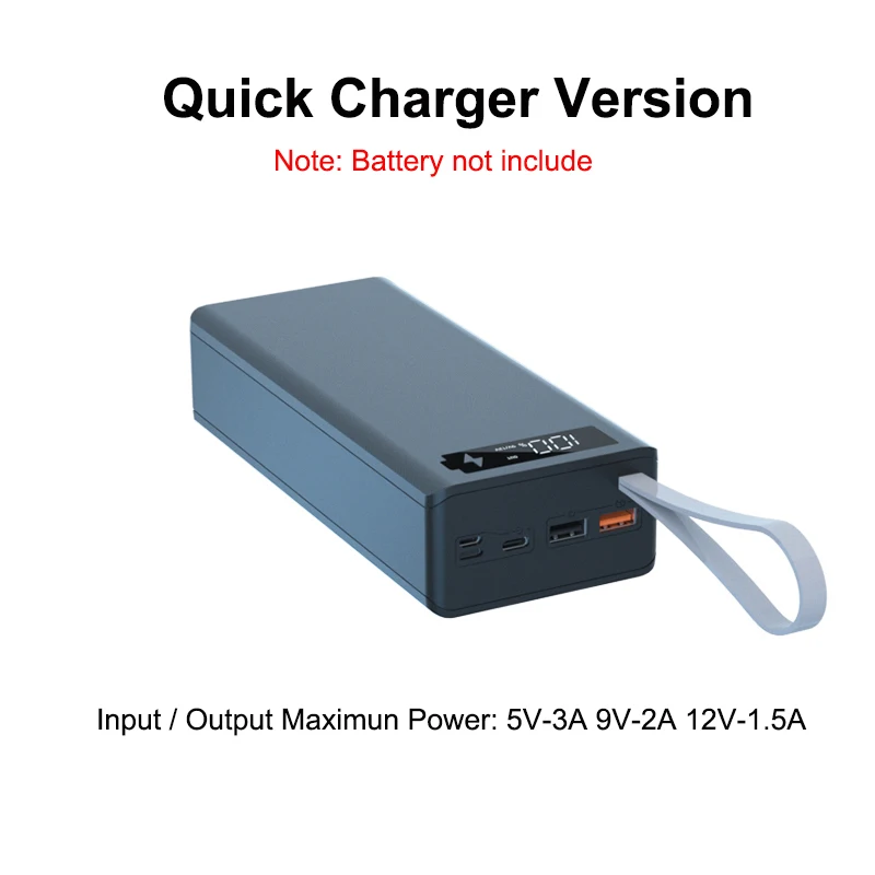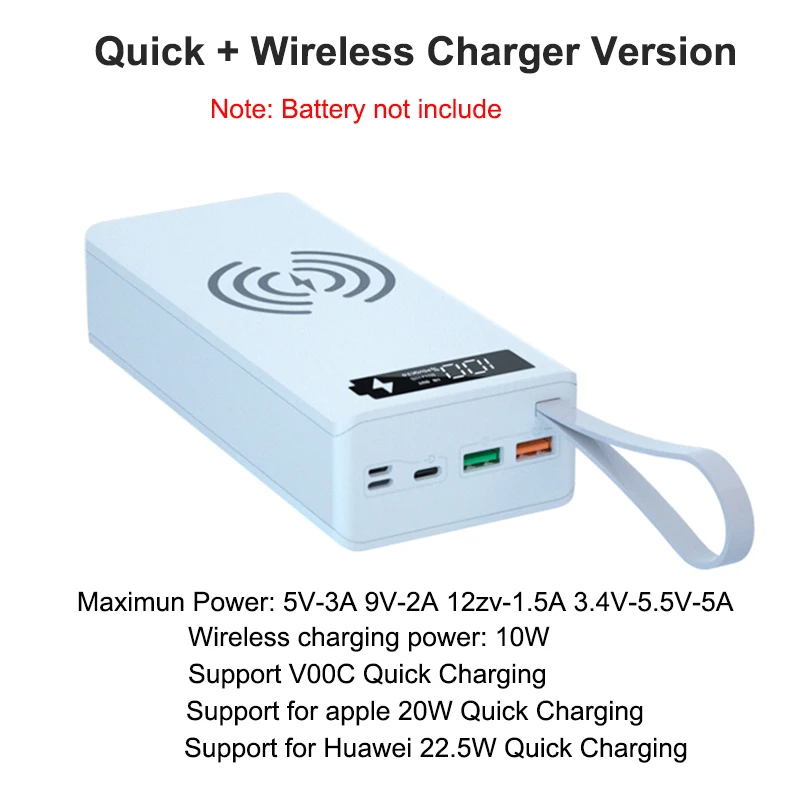 Характеристика:Размер: 186*80*44 ммЧетыре варианта коробки для хранения батарей на выбор:Максимальная мощность обычной версии: 5V-2.1A2. Максимальная мощность версии быстрой зарядки: 5V-3A 9V-2A 12V-1.5A3. Версия беспроводной зарядки Максимальная мощность: 5V-2.1AБеспроводная зарядка: 5 Вт4. Быстрая зарядка + версия беспроводной зарядки Максимальная мощность: 5V-3A 9V-2A 12V-1.5A 3,4 V-5,5 V-5AБеспроводная зарядка: 10 ВтПримечание: Зарядка зависит от вашего устройства, например: 9V-2A, если ваше устройство поддерживает 9V-2A, то оно автоматически перейдет на 9V-2A, если нет, то оно не будет прыгать4. С защитой от обратного соединенияПримечание:* Только в том случае, 18650 с плоской головкой батареи может использоваться, и напряжение должно быть с 3,2 V-4,2 V.* Вам нужно использовать совершенно новые батареи. Старые батареи и поврежденные батареи вызовут сбой в работе, неправильное подключение положительных и отрицательных полюсов, и в первый раз вам нужно использовать аккумулятор полностьюПосылка включает в себя:1 шт. чехол для внешнего аккумулятора (не включая аккумулятор)