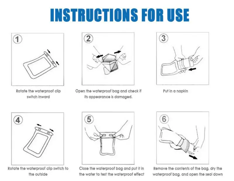 4. После использования в воде, если вам нужно вынуть изделия, пожалуйста, положите уплотнительный рот вниз, чтобы избежать остаточной влаги в водонепроницаемом