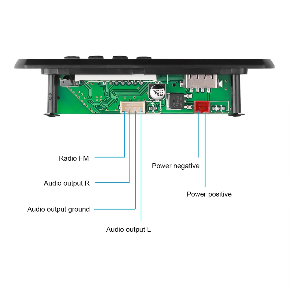 Технические характеристикиМодель: M15B Bluetooth версии 5,0. Поддержка воспроизведения музыки без потерь, с функцией защиты питания(Обратное соединение не сгорит материнская плата и дисплей не загорается)Инфракрасный Прием: может соответствовать инфракрасному пульту дистанционного управленияTF: слот для карт, подключенный к TF карте памяти (максимальная поддержка 32 Гб);Экран: цифровой цветной дисплей, красный (может быть поддерживается Настройка цветного экрана);AUX: аудио входной интерфейсИнтерфейс USB: подключение к u-диску (максимальная поддержка 32 Гб);VOL-: Короткое нажатие на предыдущую композицию в состоянии USB/SD; Короткое нажатие на предыдущую станцию в режиме FM, и долгое нажатие на громкость для уменьшения.Сканирование: короткое нажатие для воспроизведения/паузы в состоянии USB/SD, длительное нажатие для автоматического сканирования радиостанций в режиме FM;VOL +: короткое нажатие композиции в состоянии USB/SD; Короткое нажатие радиостанции в режиме FM, и длительное нажатие громкости для увеличения;Режим: когда есть sd-карта и u-диск: Переключение последовательностью является USB→SD→FM→AUX→USB; Когда есть только u-диск: Переключение последовательностью является USB→FM→AUX→USB; Когда есть только sd-карта: последовательность переключения: sd→ fm → aux→ SD;Основной контроль IC: AB5362BBluetooth IC: AB5362B версия Bluetooth 5,0Формат музыки: MP3 / WMA / WAV и другие форматы без потерьРадио FM частота: 87,5-108,0 МГцПоддержка функции Введение: поддержка MP3 / USB / TF/линейный вход/FM / BLUETOOTH/пульт дистанционного управления/DC 5 В или 12 В (5 В максимум не может превышать 5 В; максимум 12 В не может превышать 16 В, версия не превышает 24 В может быть настроена на выбор,)О конструкции: Размер панели: 106*25 мм, две стороны панели-винтовые отверстия, ширина доски-19,8 мм, глубина доски 24 мм