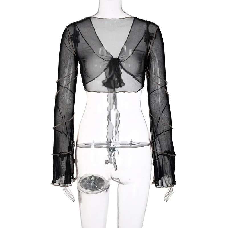 Эстетичная повязка E-girl, черные футболки с глубоким V-образным вырезом и расклешенными рукавами в готическом стиле Y2K, сетчатые кроп-топы