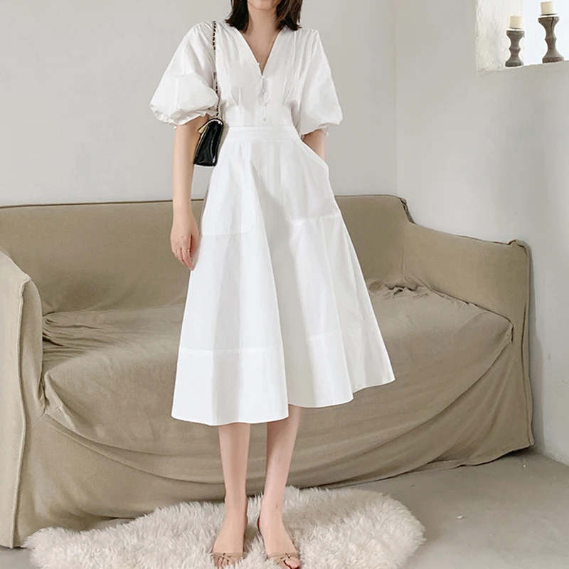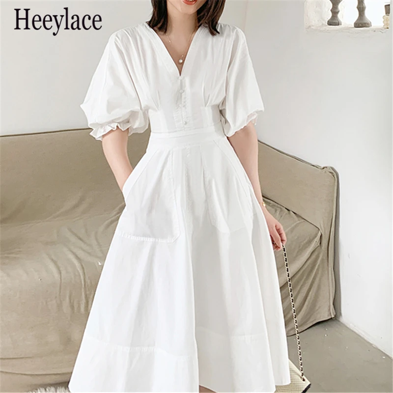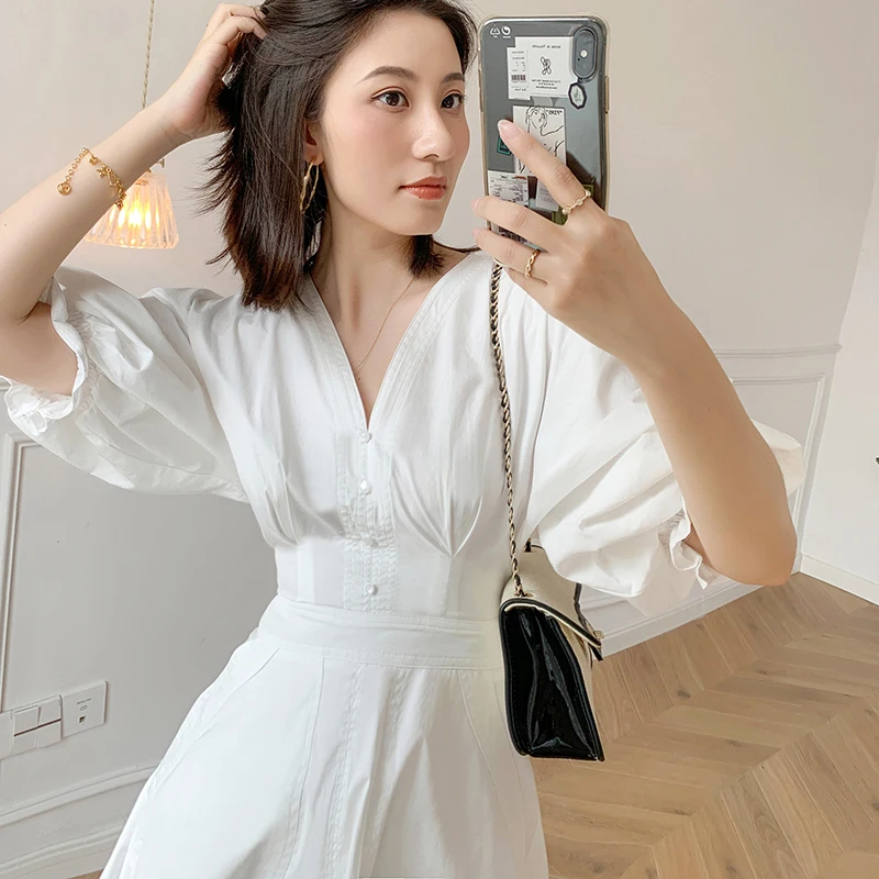 Женское платье-трапеция во французском стиле, Белое Облегающее Элегантное летнее платье с пышными рукавами и V-образным вырезом