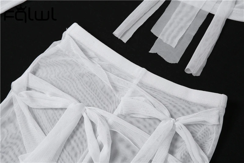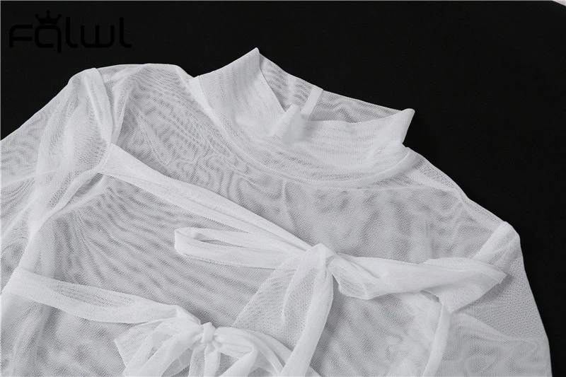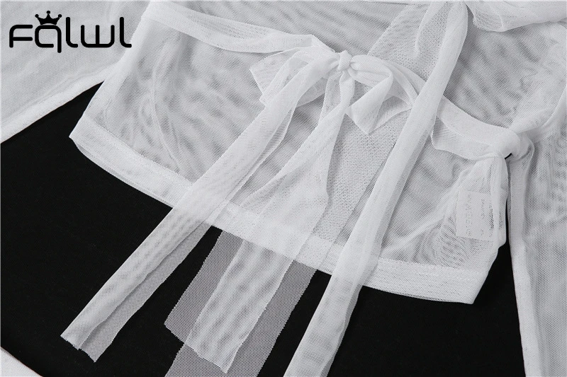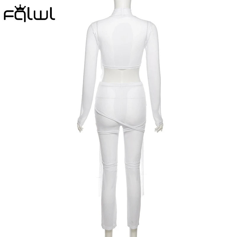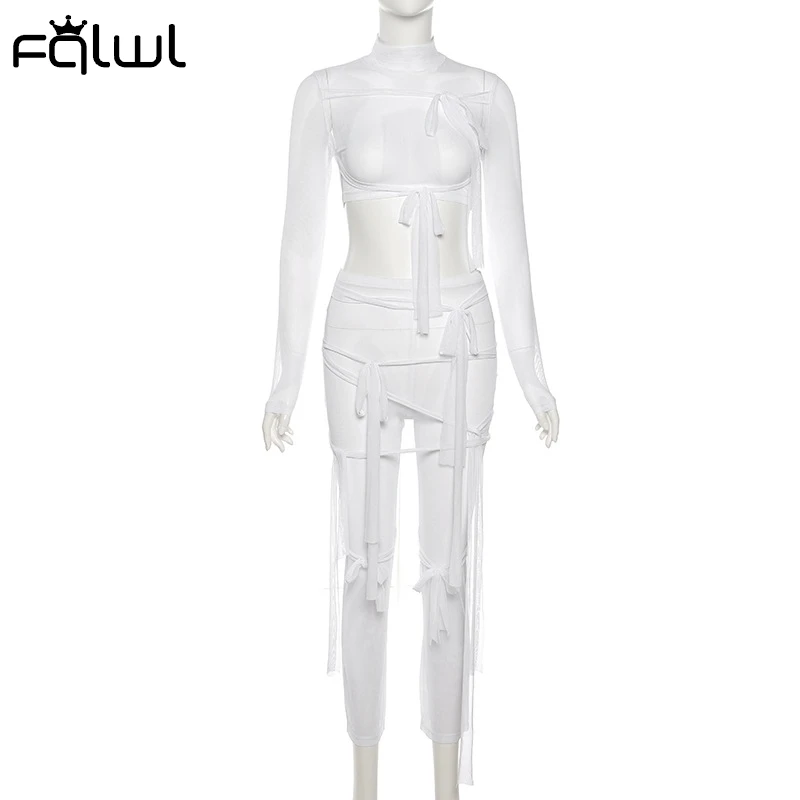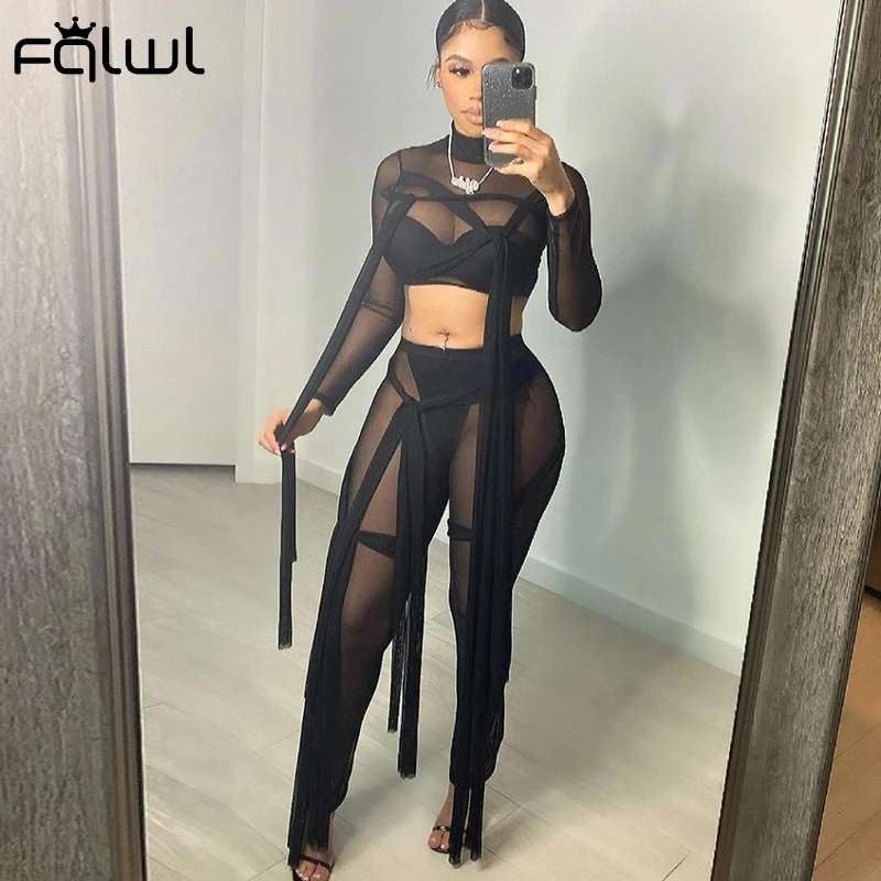 FQLWL летний бандажный сетчатый комплект из 2 предметов Женская одежда с длинным рукавом короткий топ прозрачные брюки костюмы повседневные подходящие комплекты 2021