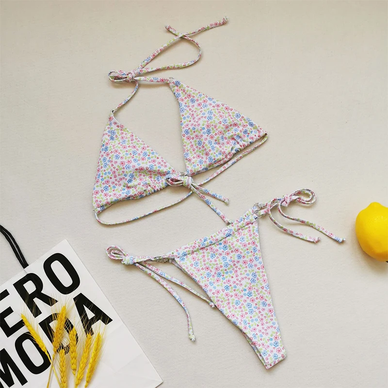 Милое бикини MYTENG с цветочным принтом, сексуальный треугольный купальник с пуш-ап, Женский комплект из 2 предметов, купальный костюм, пляжная одежда, купальник с лямкой через шею, бикини