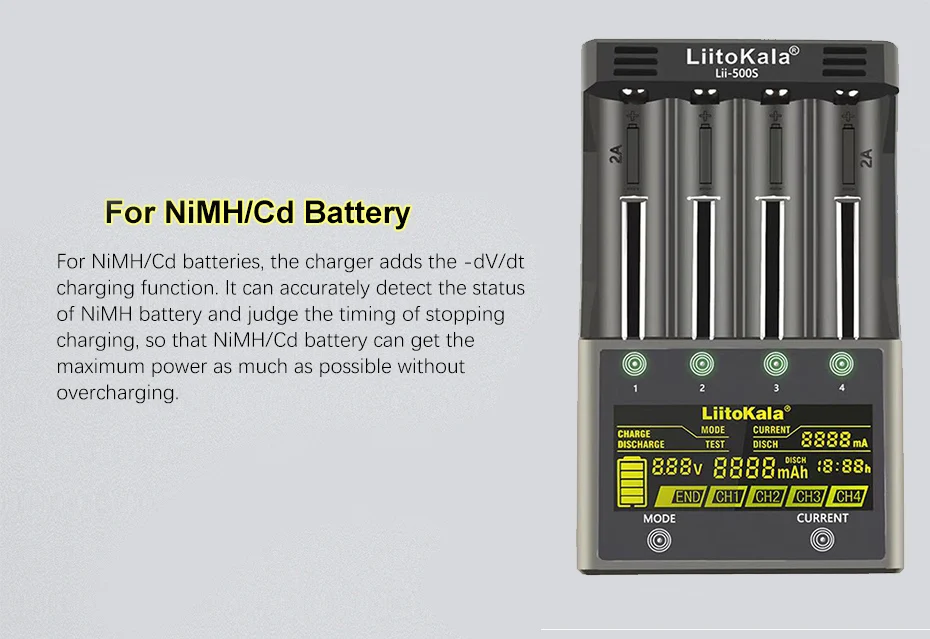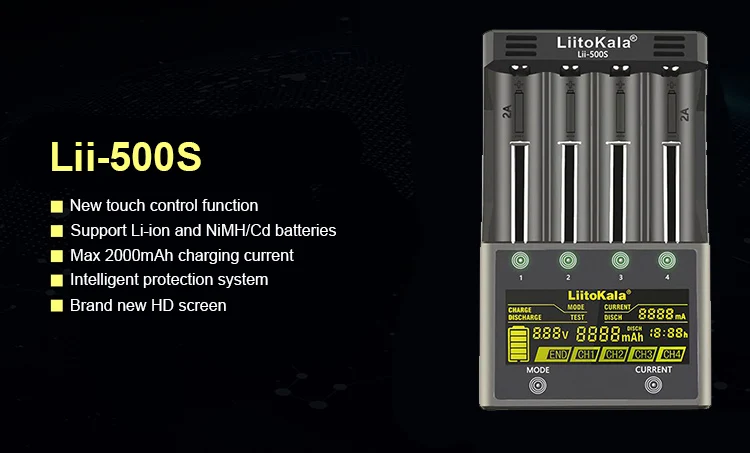 1.4 вида Регулятора Тока зарядки (mA / 500mA / 700mA / 1000mA);2. Различные спецификации (18650/26650... / AA / AAA) в зарядное устройство;3. Зарядное устройство устраняет использование отдельного ЖК-экрана, напряжения (V) тока (MA) время (H) Емкость (mAh) сопротивление (MR) опции, E... Обзор;4. В режиме зарядки 4 канала работают независимо, вы можете выбрать другой зарядный ток для зарядки и литий-ионных аккумуляторов hunchong и никель-металл-гидридных батарей.5. В режиме быстрого тестирования 4 канала могут быстро обнаруживать емкость батареи, независимо от литий-ионных батарей и никель-водородных батарей, работают независимо. Быстрый процесс обнаружения емкости аккумулятора (1 категория, 2 полных) два шага6. Ни в тестовом режиме, емкость батареи, как правило, находится три шага процесса (1 сначала заряжен, затем разряжен 2 и 3 пополнения), процесс обнаружения емкости батареи;7. Зарядка и быстрый тест/без теста 3 режима могут работать одновременно; Независимая Возможность зарядки/быстрого обнаружения/нормальная емкость обнаружения;8. Различные функции защиты: перегрузка и перегрузка, короткое замыкание, температура, напряжение функции 0 В активируется, (& Delta; V и 0 & Delta; V), 1,65 B 2,2 B нельзя заряжать, Интеллектуальное распознавание плохой батареи и защита от обнаружения обратной батареи.9. Со стандартным выходом USB 5 В/1000 мА: 1-4 литиевые батареи, литиевые батареи, выход USB, продукт не может быть никель-металл гидридный аккумулятор с выходом USB.10. Со специальным адаптером питания: входное напряжение постоянного тока: 12 В/2 А.Описание ключей:1. Зарядное устройство имеет шесть кнопок, ключевой режим (режим), текущий выбор ключа (NAP) и просмотр данных независимо от выбранного ключа (1234), использование простого и удобного;2. Удерживайте клавишу Mode в любом чехол, и в течение 3 секунд, чтобы изменить режим (бесплатно) или быстрый тест без тестирования (тест емкости), затем нажмите снова соответствующие функциональные клавиши могут быть изменены в течение 8 секунд, ток, независимый, Hunchong, тест емкости, Выбранная функция через 8 секунд в рабочем состоянии, в рабочем состоянии может нажать (1234) для просмотра тока (MA) /емкости (mAh) /напряжения (V) /времени (H) /Информация о сопротивлении (MR).Упаковочный лист:1 * зарядное устройство LiitoKala Lii-500 (без аккумулятора)Адаптер 1*12V 21 * Автомобильное зарядное устройство1 * Руководство пользователя1 * упаковочная коробка