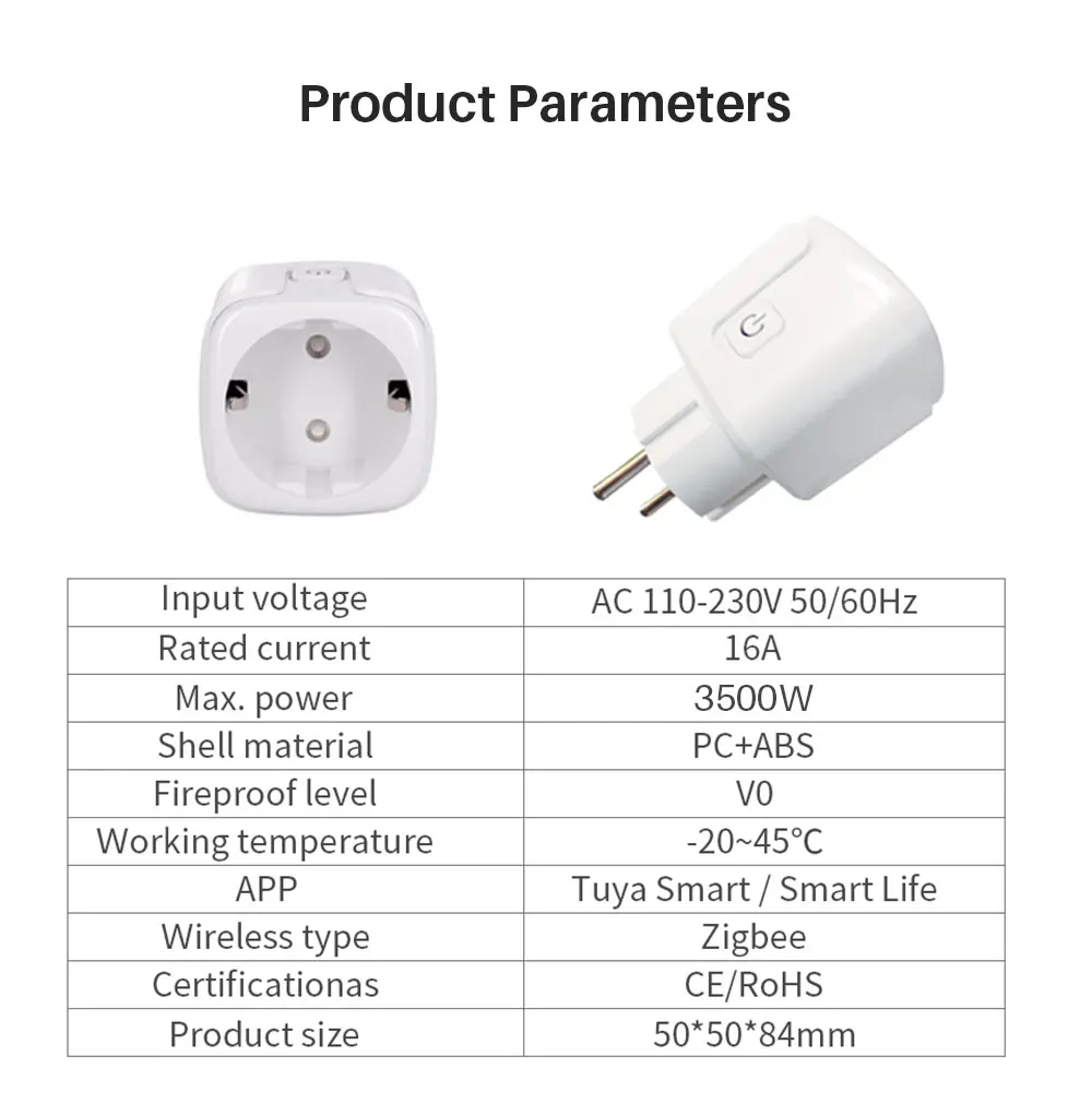 Входное напряжение: 110-230 В/50-60 ГцВыходной ток: 16А (макс.)Максимальная мощность: 3500 Вт (макс.)Корпус: АБС + Поликарбонат огнеупорный материалХарактеристики: штепсельная вилка европейского стандартаСертификация: CE/ROSHРабочая температура: -20 °C-50 °CТип беспроводной сети: Zigbee 3,0Цвет: белыйПриложение: SmartLife / TuyaПоддержка: Alexa Google и Alexa