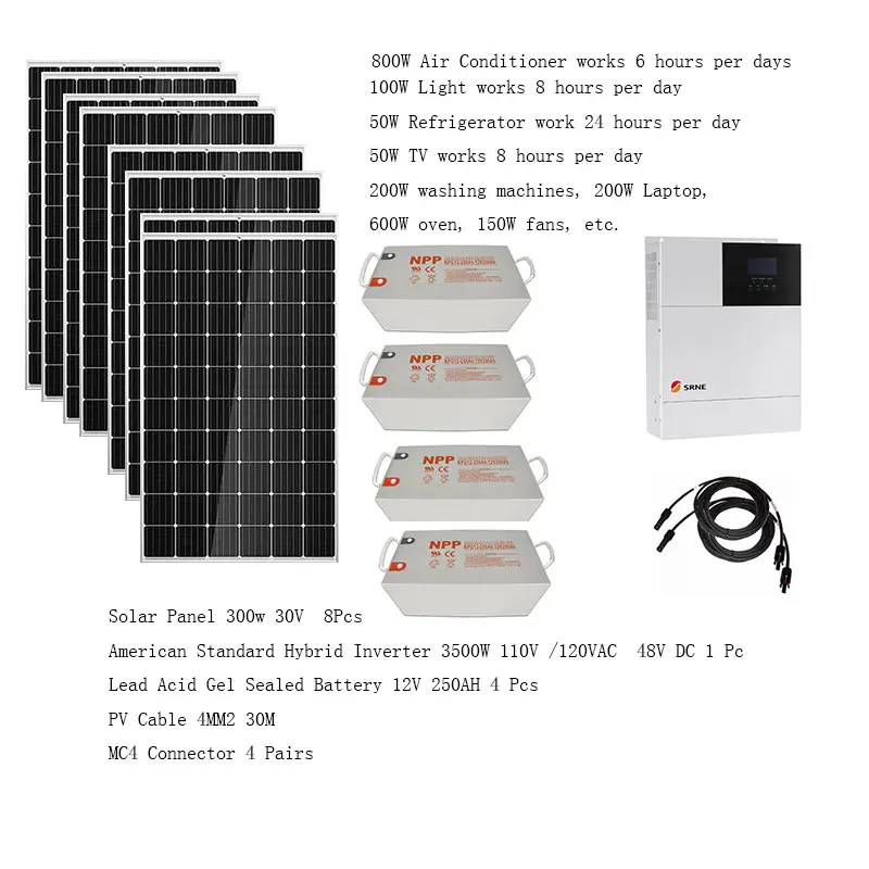 Заказ включает в себя следующие элементыПанели солнечные 300w блок питания 30В 8 шт.Гибрид американского стандарта3500 Вт Инвертор с зарядным устройством 110V /120VAC48 В постоянного тока 1 шт.Свинцово-кислотный гелевый герметичный аккумулятор12V 250AH 4 предмета в комплектеPV кабель 4мм2 30 мРазъем MC4 4 парыСистема может работать под бытовой техникой800 Вт кондиционер работает 6 часов в деньСветильник 100 Вт работает 8 часов в день50 Вт холодильник работает 24 часа в сутки50 Вт ТВ работает 8 часов в день200 Вт стиральные машины, 200 Вт ноутбук,600 Вт печь, 150 Вт вентиляторы и т. Д.