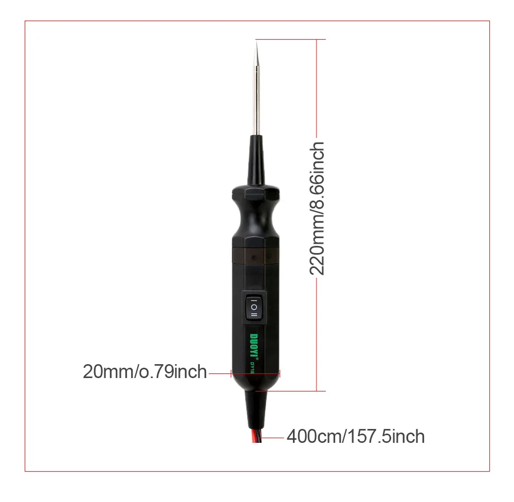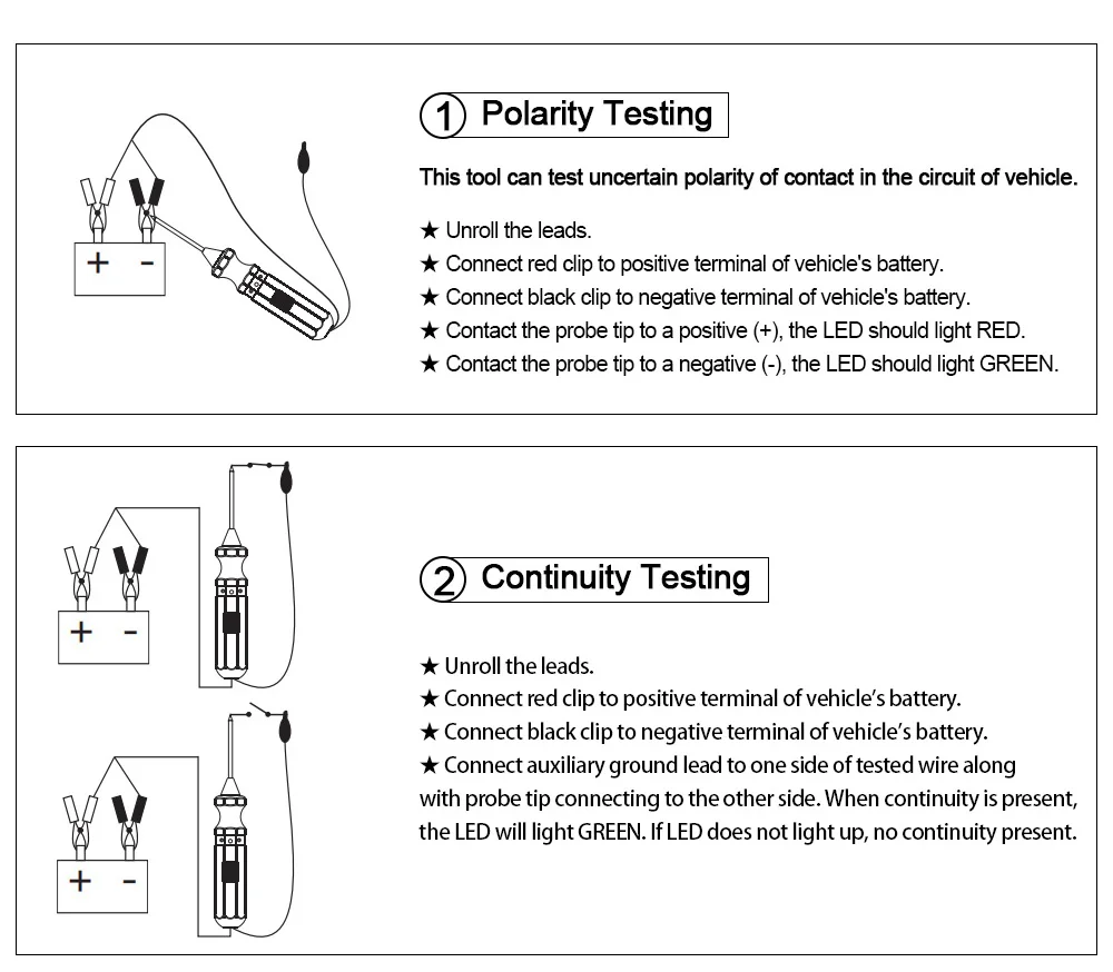 DUOYI DY18 автомобильный тестер электрических замыканий для поиска короткого и открытого замыкания датчик мощности автомобильная электрическая система диагностические инструменты 6-24 В постоянного тока Устройство является лучшим электрическим тестером для сокращения времени диагностики в автомобильных электрических системах. Его длинный кабель позволяет легко тестировать. После простого подключения устройства к батарее транспортного средства, автомобильный техник может провести положительный или отрицательный ток батареи на наконечник, раскачивая выключатель питания вперед или назад. Устройство имеет защиту от короткого замыкания и может мгновенно протестировать плохие наземные контакты. Это позволяет отслеживать и находить Короткие цепи. Он также может проверить непрерывность с помощью своего вспомогательного наземного свинца. Это полный набор для тестирования постоянного тока 6-24 В. Схема руководства Применение: 1. Тест на непрерывность 2. Проверка полярности напряжения 3. Проверка выключателей, реле и ВКЛ-ВЫКЛ диодов, предохранителей и цепей 4. Тест на полярность электрических кабелей и вилок 5. Отслеживайте и находите Короткие цепи 6. Тест на плохие наземные контакты Спецификация: Рабочее напряжение: 6-24 В постоянного тока Длина кабеля: около 4 м Защита от перегрузки: 8A (когда ток превышает 8A, этот элемент автоматически отключит ток.) Вес: около 200 г Do's and don'ts: 1. Не используйте изделие вокруг взрывоопасных газов, пара или пыли. Когда выключатель питания нажимается (или качается), ток батареи проводится непосредственно на наконечник, который может вызвать искры при контакте с землей или определенным Цепи. 2. Устройство не будет использоваться с 110/220V дом в настоящее время, он используется только для с источником питания от постоянного тока, 6 ~ 24V систем. 3. Не используйте напряжение переменного тока. 4. После завершения проверки транспортного средства, правильно восстановили все соединения, которые вы отключили. 5. Всегда следуйте инструкциям и процедурам, указанным в Руководстве по обслуживанию транспортного средства, прежде чем попытаться отключить любую часть или подсистему электрической цепи. 6. Никогда не прикасайтесь к любой опасной части транспортного средства рукой для безопасности. Не прикасайтесь к живым проводникам вручную или кожей. 7. Не используйте его, если он поврежден. 8. Некоторые компоненты транспортного средства работают на низком напряжении, они не могут выдерживать напряжение, связанное с товаром. Чтобы избежать повреждения этих компонентов, не используйте устройство для прямого или косвенного нанесения напряжения. 9. Перед вождением, пожалуйста, всегда убедитесь, что транспортное средство безопасно и надежно. 10. Не используйте этот товар во время вождения. Посылка: 1x Тестер цепи 1 Руководство пользователя (на английском языке)