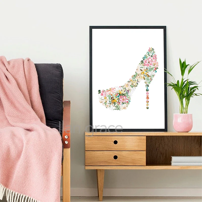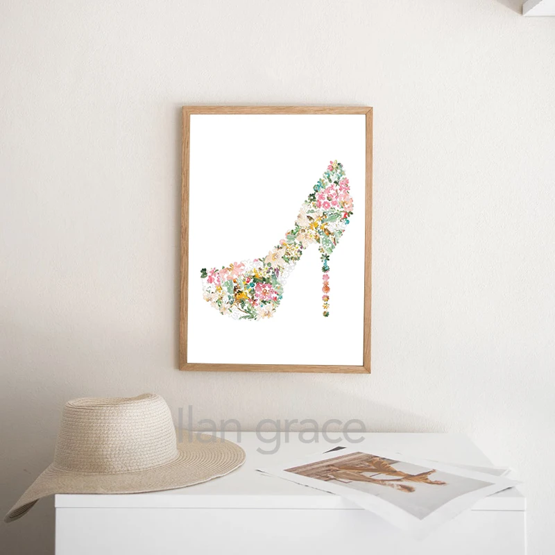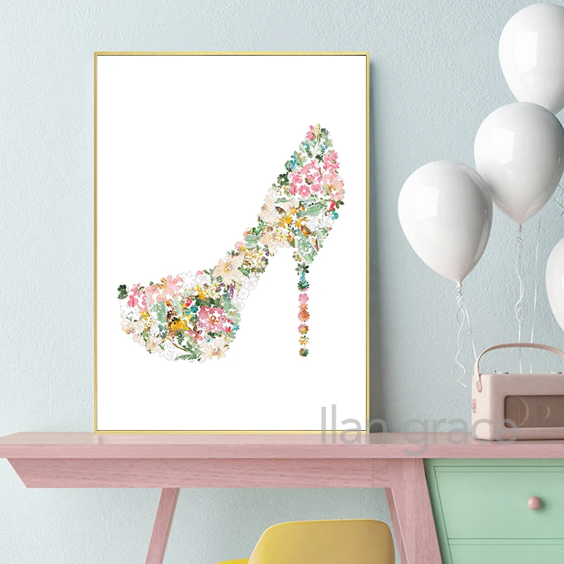 Современные модные цветочные туфли на высоком каблуке с художественным принтом для гардеробной, украшение для стен, Акварельные Цветы, картина, холст, постер, подарок для девушки