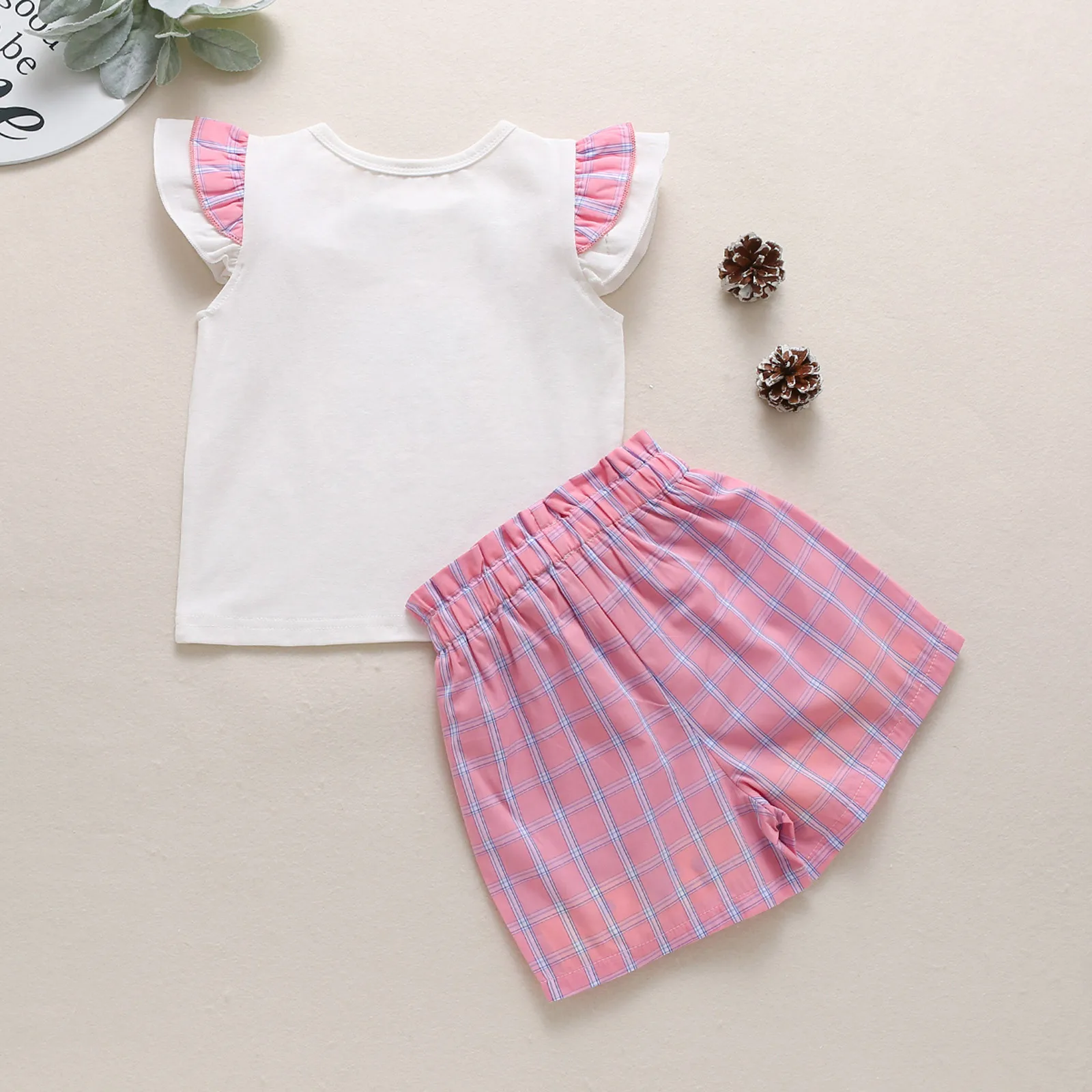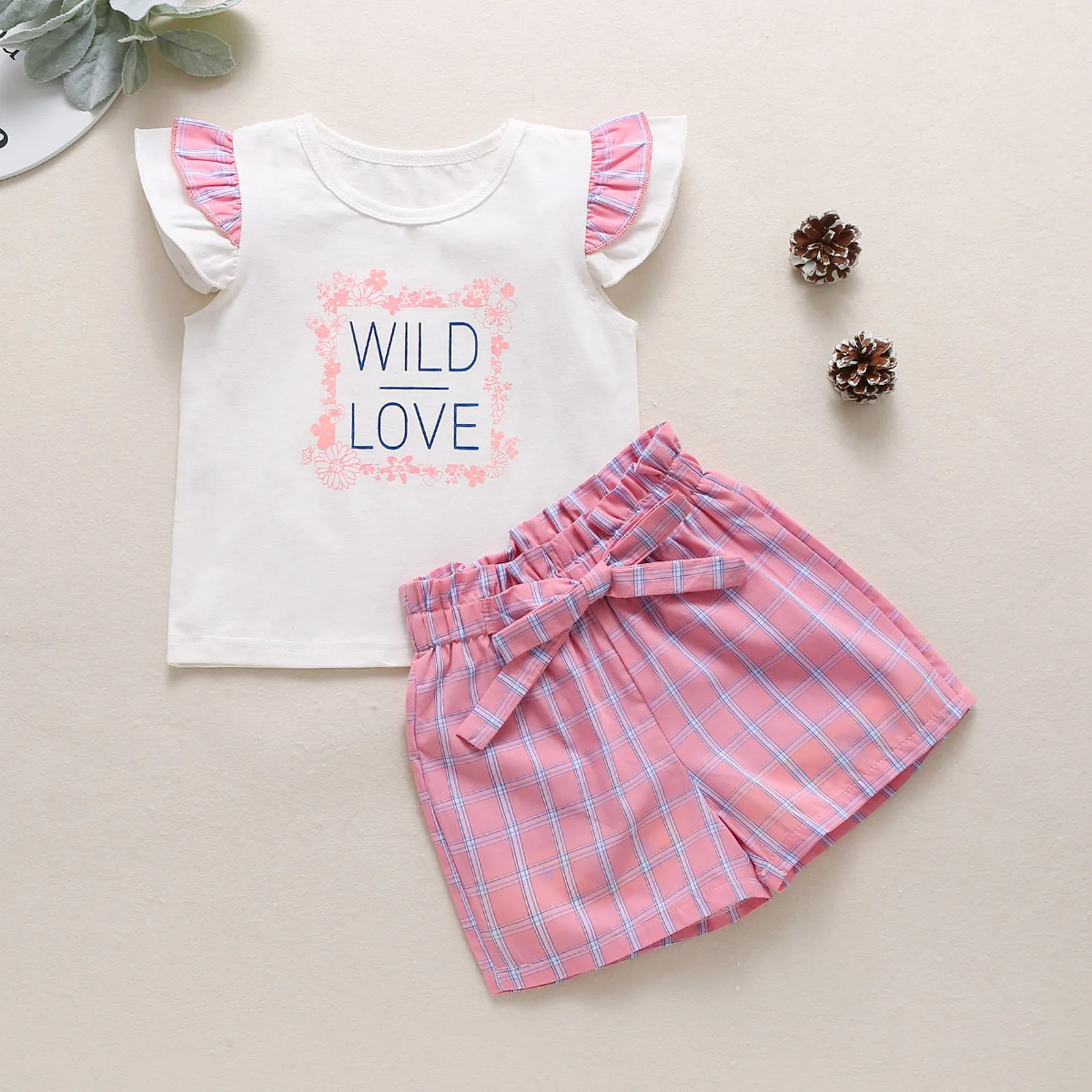 Комплект одежды для маленьких девочек, рубашка с буквами и цветочным принтом, топ в клетку и шорты, одежда для маленьких девочек