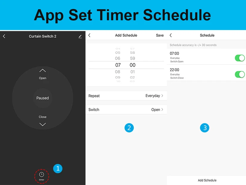 5: настройки времени: вы можете установить время для регулярного открытия или закрытия занавески, например, открытия в 7:00 и закрытия в.