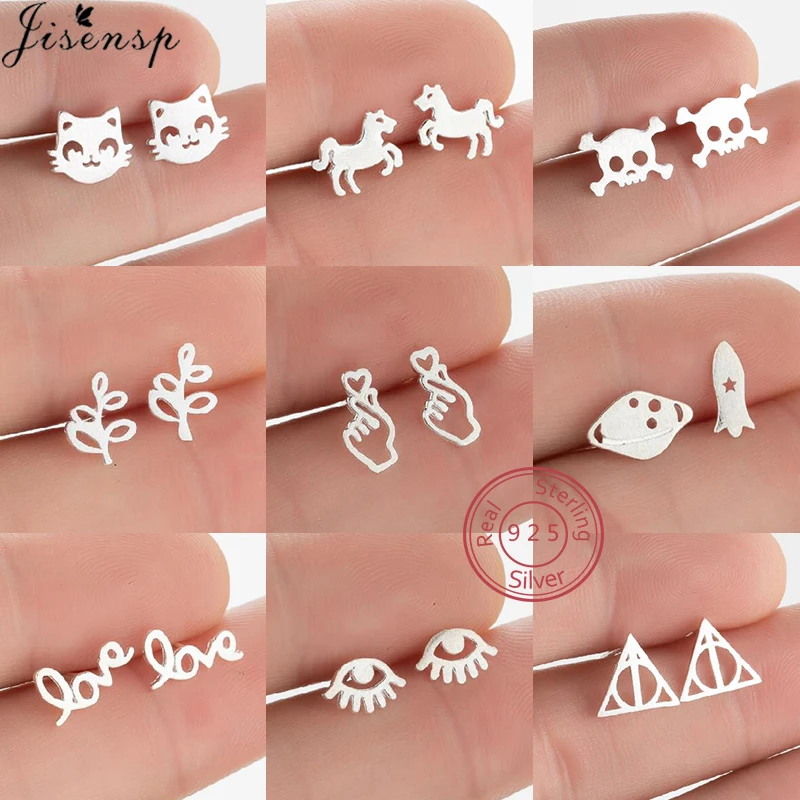 Минималистский 100% 925 стерлингового серебра серьги маленькая кошка лошадь лист любовь череп, серьги со шпилькой, для женщин, для детей на каждый день, ювелирные изделия в качестве подарка