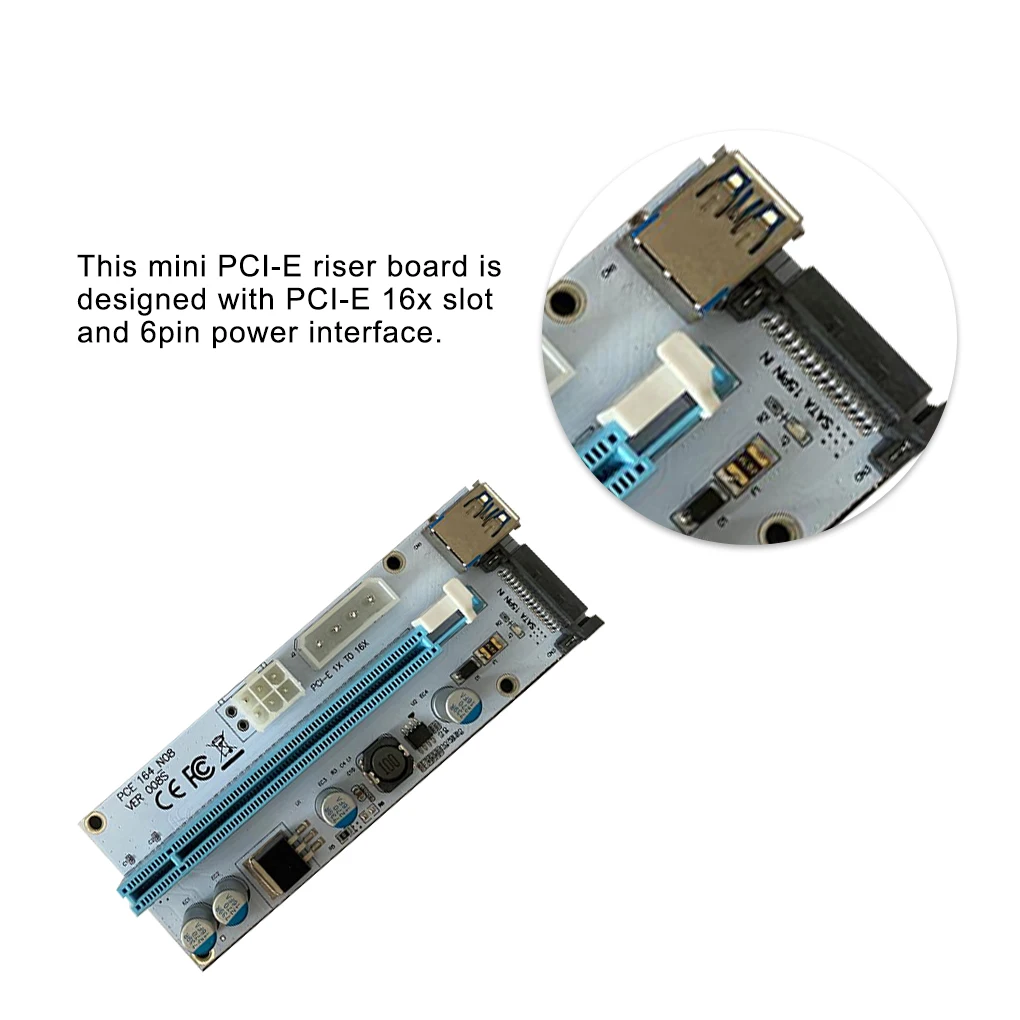 Эта мини-плата PCI-E riser разработана с разъемом PCI-E 16x и 6-контактным интерфейсом питания.