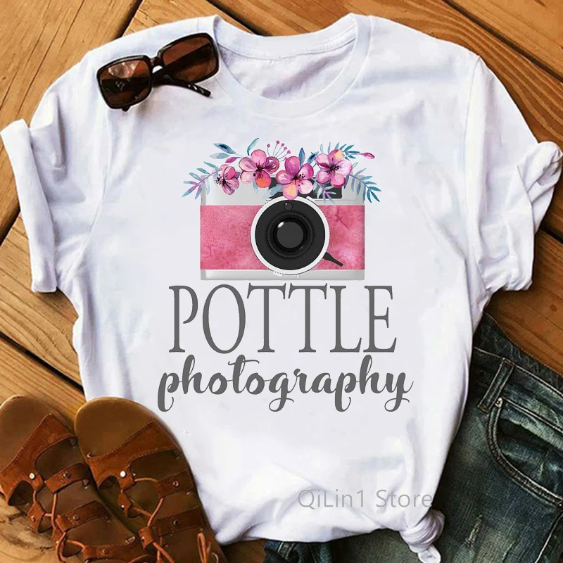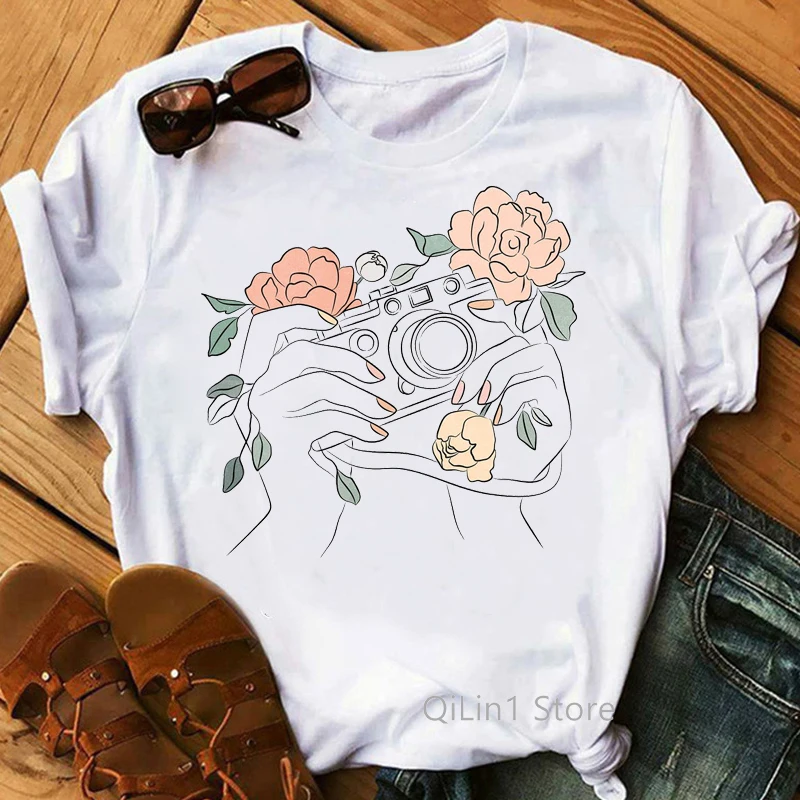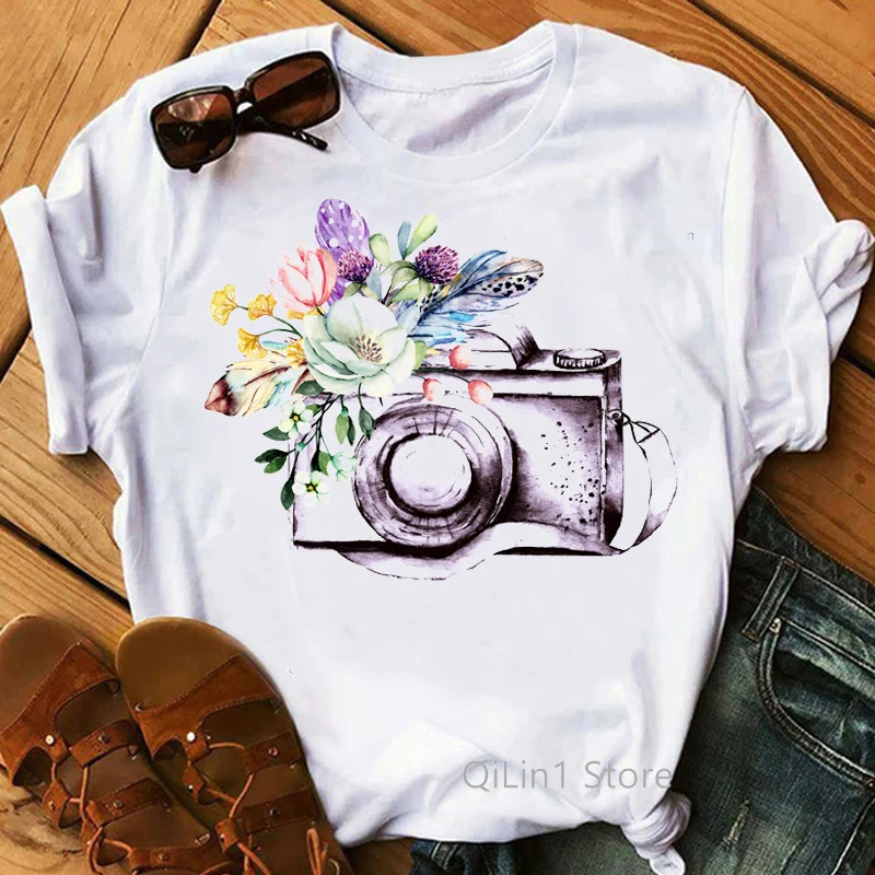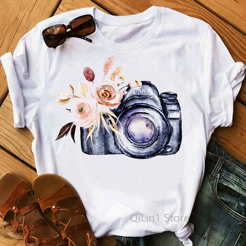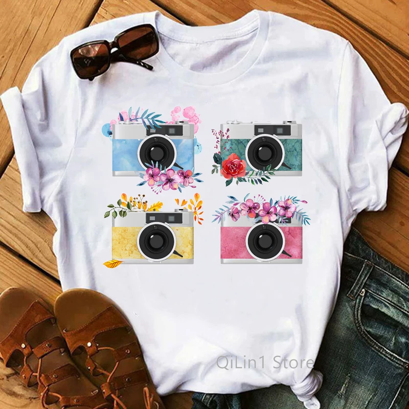 Винтажная футболка с камерой и цветочным принтом, Женская Милая футболка, женский летний топ, Женская Повседневная футболка, одежда для девочек, футболки
