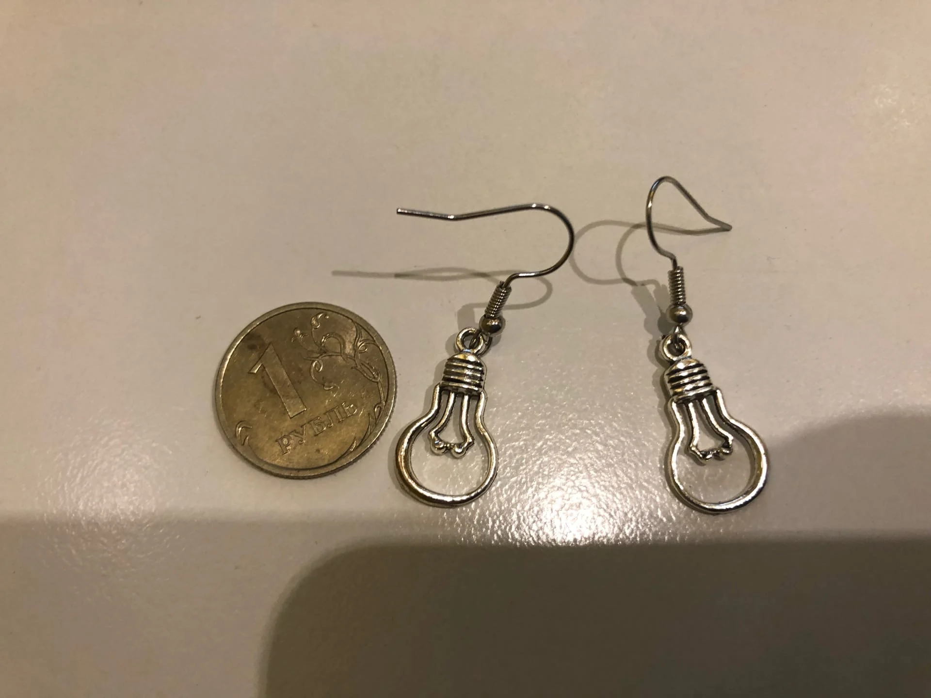 Сами серьги (то есть висюльки-лампочки) сделаны очень хорошо, действительно металлические, детали хорошо и ровно выточены. Но: очень неаккуратная фурнитура, вот эти крючки, на которые вешаются лампочки, согнуты не очень ровно, из-за чего висюльки свободно висеть не могут. Если даже руками расправить, то они будут неподвижно торчать, это не очень красиво выглядит. Может быть, на второй фото увидите - левая серёжка, если спустить висюльку в центр крючка, будет просто стоймя и прямо стоять. Наверное, это можно попробовать исправить плоскогубцами, попробую мужа попросить )) За эту цену всё равно хорошая покупка.