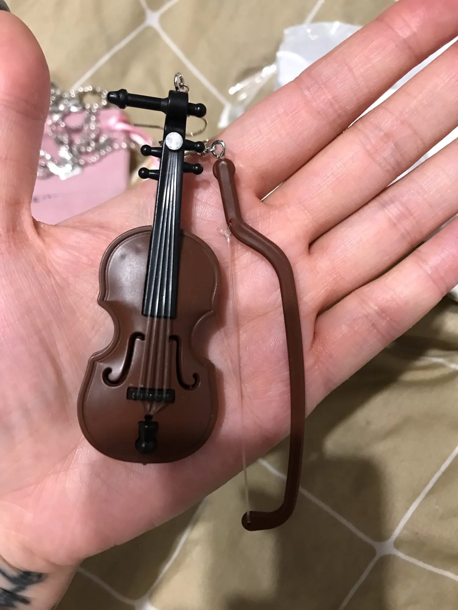 Слишком большой для сережек. Я купил его, чтобы сделать ключ для моего сына, который играет в песок. Ему очень понравилось, это очень реалистично. Струны выглядят как настоящие. 100% рекомендуется