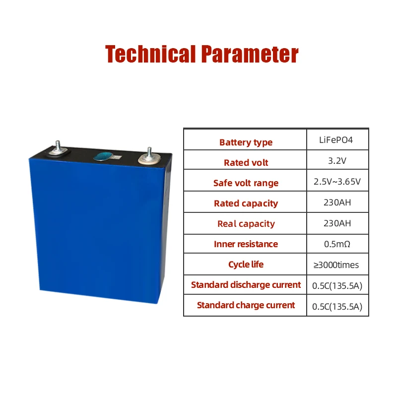 Нормальная емкость: 220-230 АчНормальное напряжение: 3,2 ВНапряжение зарядки: 3,65 ± 0,05 ВВнутреннее сопротивление: ≤ 0,25 МОмКонечное напряжение разряда: 2,5 ± 0,05 ВСтандартный зарядный ток: 1CМаксимальный ток заряда: 1CМаксимальный ток разряда: 3CВес: 4110 ± 200 г