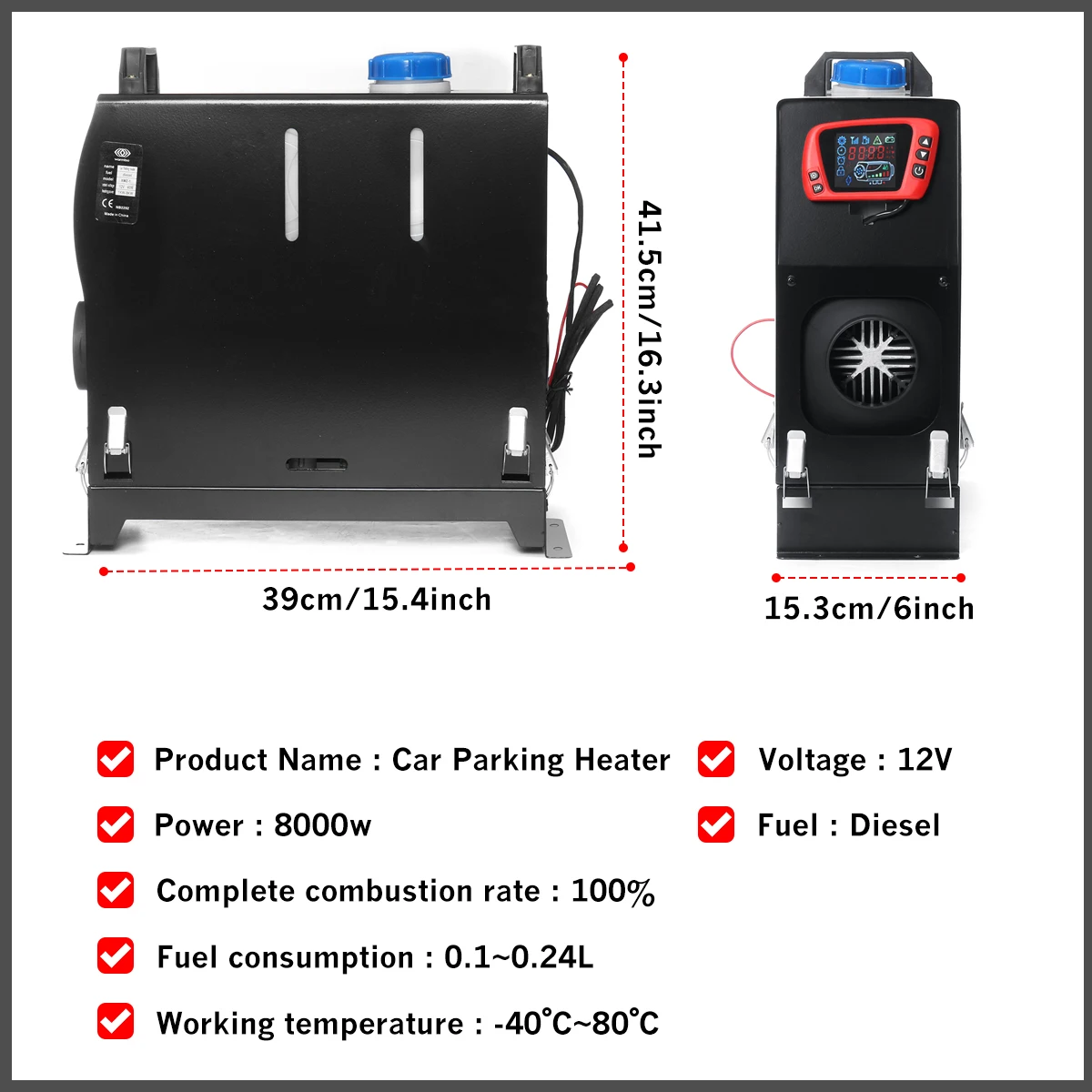 Характеристики:Материал: металл + пластикЦвет: белый + черный;Размеры: 15,3 × 39 × 41,5 см (6 × 15,4 × 16,3 ")Напряжение: 12 ВМощность: 8000 ВтТопливо: ДизельПолный коэффициент сгорания: 100%Расход топлива: 0,1 ~ 0,24 лРабочая температура: -40 °C ~ 80 °C