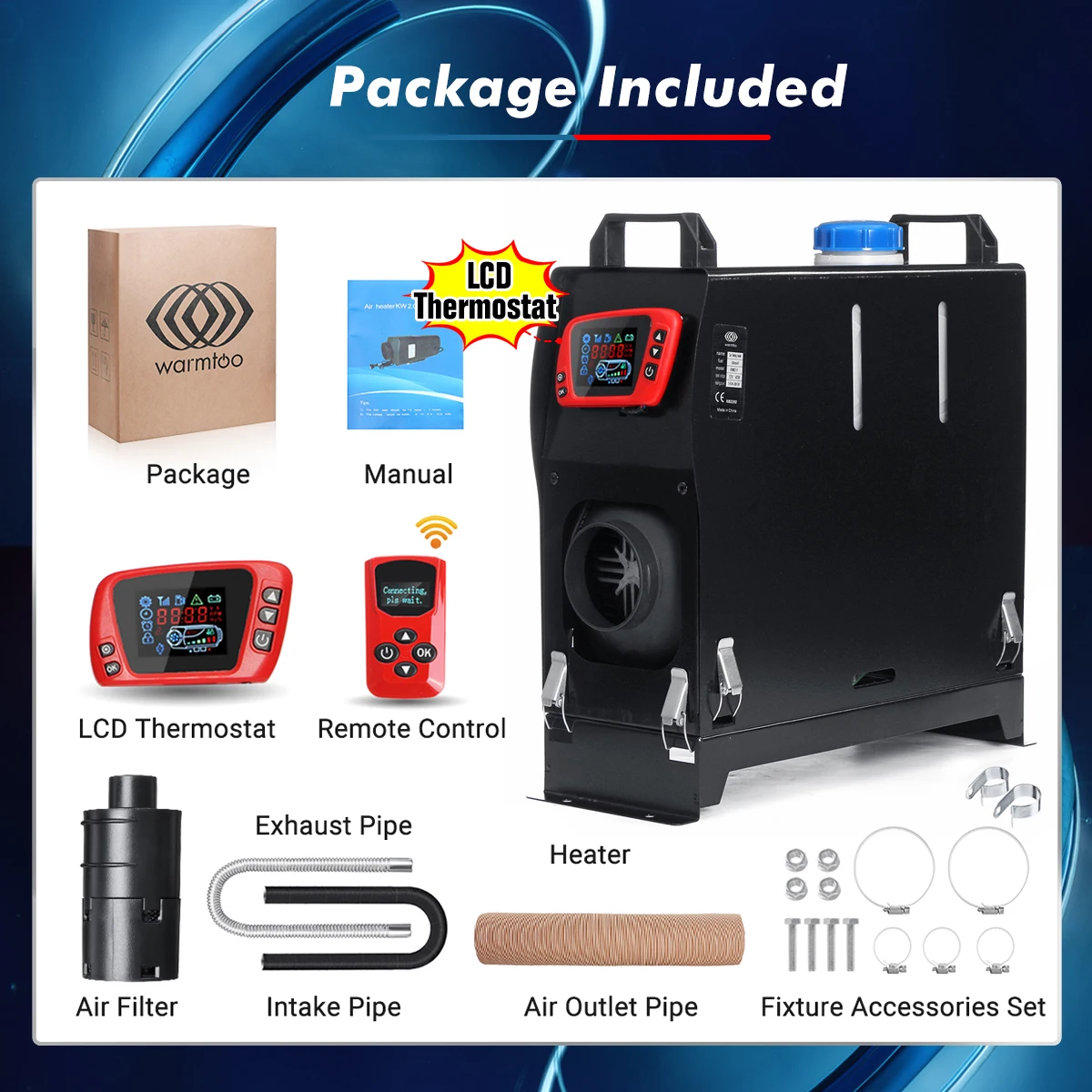 Посылка включает в себя:1 x парковочный обогреватель (ЖК-термостат)1 x красный пульт дистанционного управления (батарейки в комплект не входят)1 х воздуховодная труба1 х впускная труба1 х выхлопная трубаНабор аксессуаров для крепления-1 шт.
