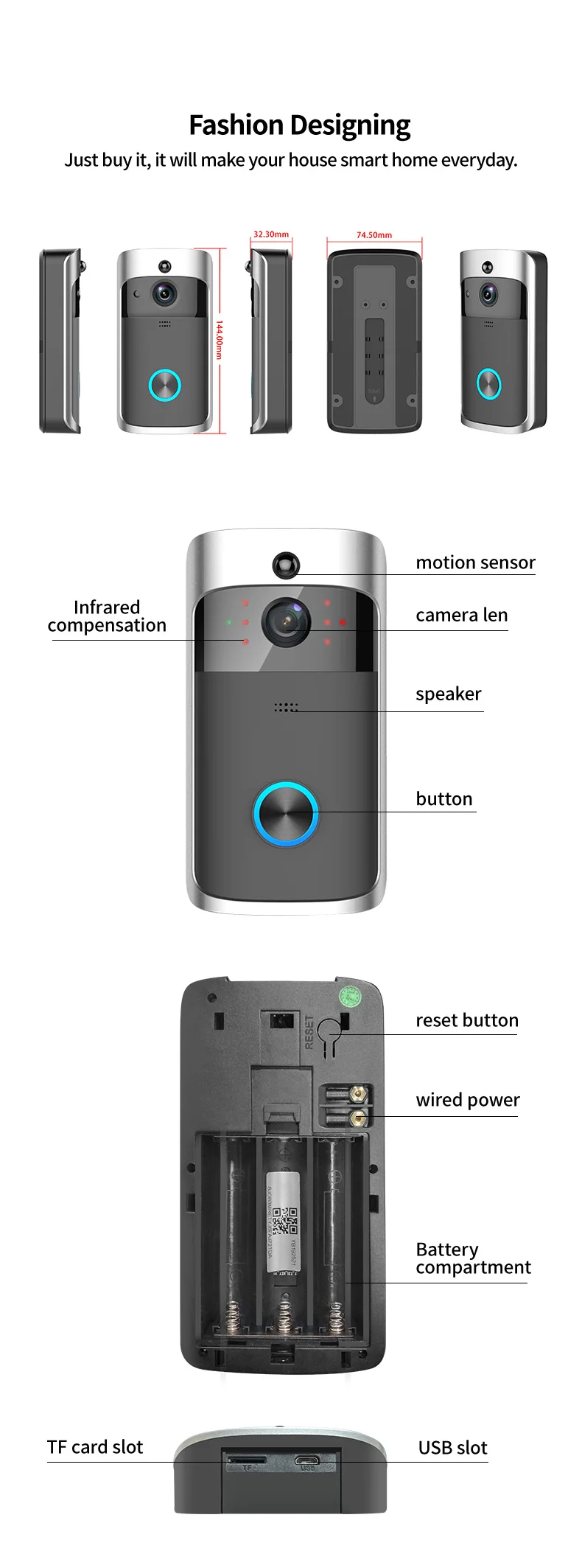 Характеристики: беспроводное соединение, сверхнизкое энергопотребление, дистанционное активное пробуждение, быстрая звездаИспользование: гости могут посетить видео, голосовые звонки и кратковременное видео, директору не нужно открывать дверь, а затем знать информацию о желающемРежим пробуждения: кнопка пробуждения дверного звонка, обнаружение тела PIR пробуждение, мобильный телефон активный ПробуждениеСигнал тревоги: Быстрое нажатие в течение 3-5 секундОнлайн-пользователи: Поддержка нескольких пользователей онлайн-часов одновременноДатчик: Автоматический баланс белого, автоматический контроль усиления, Автоматическая компенсация подсветкиОтношение сигнал-шум: >39 дБНочное видение: Авто ICR, 6 шт. 850nmMil Strongpower инфракрасная лампа, 10 метровРазрешение: 720PTalkback: Двусторонняя Речевая интеркорм, с эхо-отменойБеспроводная сеть: 802.11b/g/nБезопасность сети: шифрование безопасности WPSРежим видео: Мобильное видео обнаружения, кнопка дверного звонка триггера видео, ручная запись видеоПамять: максимальная поддержка 32 Гб TF картыРежим питания: источник питания батареи, 3 шт. 18650 батарейМощность: Стандартный ток 400uA, рабочий ток 200мАРабочая среда: Рабочая температура: -10-50 градусов; Рабочая влажность:<95%Способ установки: ворота или настенная установкаМатериал: АБС-пластик + электронный оригинал