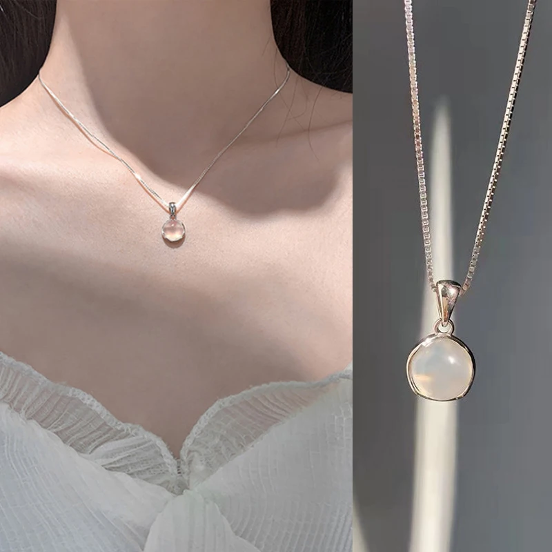 Женское круглое ожерелье с подвеской из белого халцедона с нишевой дизайнерской цепочкой на ключицы.