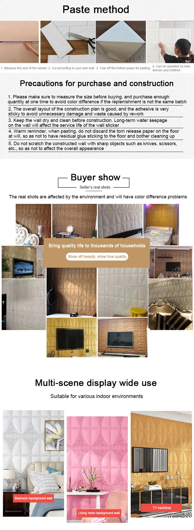 По сравнению с обоями, это безопасный, экологически чистый, нетоксичный и безвкусный, мягкий материал, 3D-эффект, самоклеящийся, простой в установке, случайный коллаж и произвольная резка. Обладает лучшим шумоподавлением, звукоизоляцией, защитой от столкновений, легкой очисткой, влагостойкостью и защитой от плесени.
