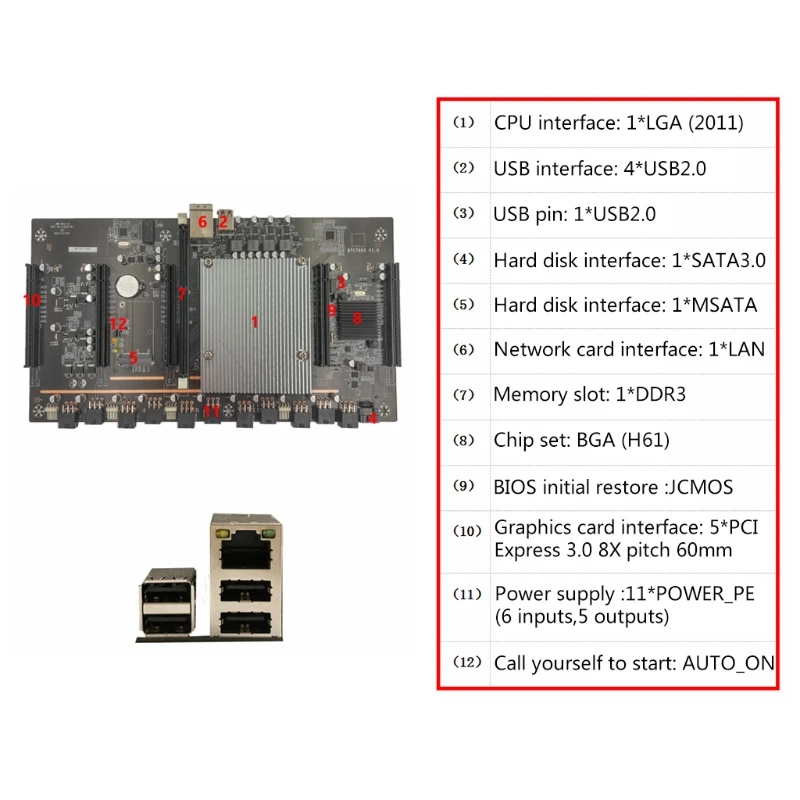 Чип H61 и одноканальный разъем ЦП LGA 2011.,5 интерфейс видеокарты PCIe 3,0 X8., мощность обработки одного GPU составляет до 48 мгн/с, и он идеально поддерживает видеокарты s с видеопамяти 4 Гб, что значительно улучшает функцию майнинга вычислительной мощности. Поддержка графических карт 3060., слот для видеокарты на большие расстояния 60 мм.,