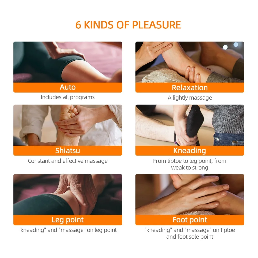 СТехнология utting-edge. Для изготовления этого массажера для ног используется передовая технология сжатия воздуха. Исследования показали, что данный массажер может эффективно решать следующие проблемы: все более толстые ноги; Растяжение, вызванное высокими каблуками; Отеки ног; Боли в суставах; Дискомфорт в холодные/дождливые дни; переразвитые икроножные мышцы. Почувствуйте себя руками. Мы'Горжусь нашим научным моделированием руки. С помощью этого массажера наш массажер может точно массировать каждую точку точечного массажа, предоставляя вам комфортные ощущения от массажа. Икры, лодыжки, пятки и ноги, наш массажист всегда знает, что вы хотите и делаете то, что вам нужно. 6 видов удовольствия. Вы можете переключаться между 6 программами, чтобы наслаждаться различными массажами. Авто включает в себя все программы; Расслабление-это легкий массаж; Шиацу означает Постоянный и эффективный массаж; Разминание-от палантинов до ног и от слабых до сильных; точка ноги включает в себя "разминание" и "массаж" на точку ноги; Точка стопы означает "разминание" и "массаж" На палантине и стопе подошва точка. Обертывание на 360 °. Мы предоставляем вам всесторонний массаж от ног до икр-Он охватывает все области. Это намного лучше, чем массирование человека, так как вам не нужно беспокоиться о пропуске акупунктурных точек. Так что просто расслабьтесь и наслаждайтесь. Переменная интенсивность. Там'Увеличьте до 3 дополнительных сил массажа, чтобы вы могли наслаждаться индивидуальным массажем. Первая Экипировка для отдыха-попробуйте и смывайте усталость после тяжелой работы. Вторая Шестерня для успокоения. Он может эффективно успокоить ваш ум, расслабить ваши мышцы и питать ваше тело. Третья передача обладает мощной прочностью. Это тщательный массаж и вы'Получите все желаемые эффекты. Дополнительная функция нагрева. Массаж может обеспечить лучший эффект, когда он выполняется совместно с нагревом, и именно поэтому мы добавляем эту функцию в наш массажер. Он способствует усилению эффекта массажа, при этом делает массажер более похожим на руки человека. Более гуманизированный дизайн. Благодаря мощной липучке наш массажер регулируется по размеру и имеет прочную липкость, что делает его намного более удобным в использовании. С высококачественной розеткой это изделие становится более прочным и используется для сверхдолгое время. Более того, его низкое напряжение позволяет пользоваться им каждому, даже ребенку, с легкостью.