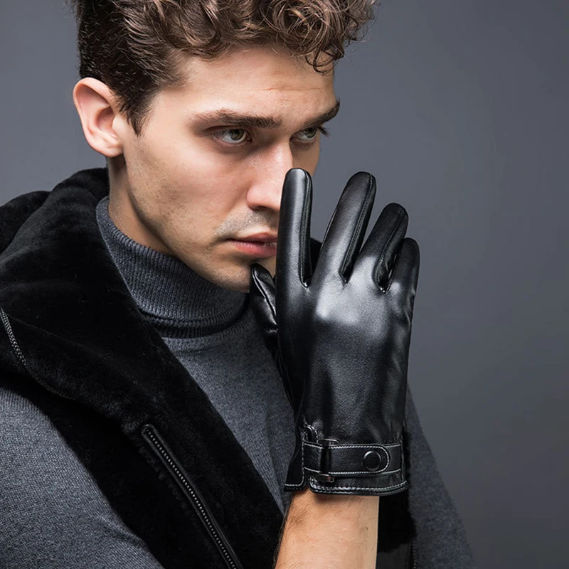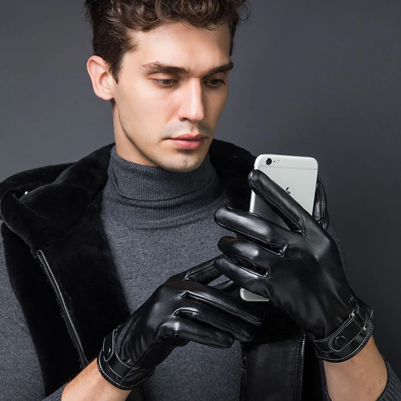 Мужские кожаные перчатки черный плюс бархатные рукавички эластичные...