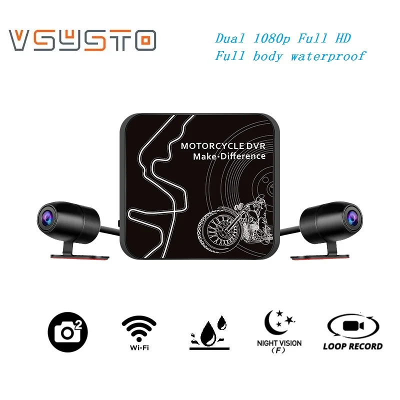 Видеорегистратор VSYSTO для мотоцикла, полноразмерная Водонепроницаемая камера для приборной панели с разрешением 1080p, Wi-Fi, ночным видением