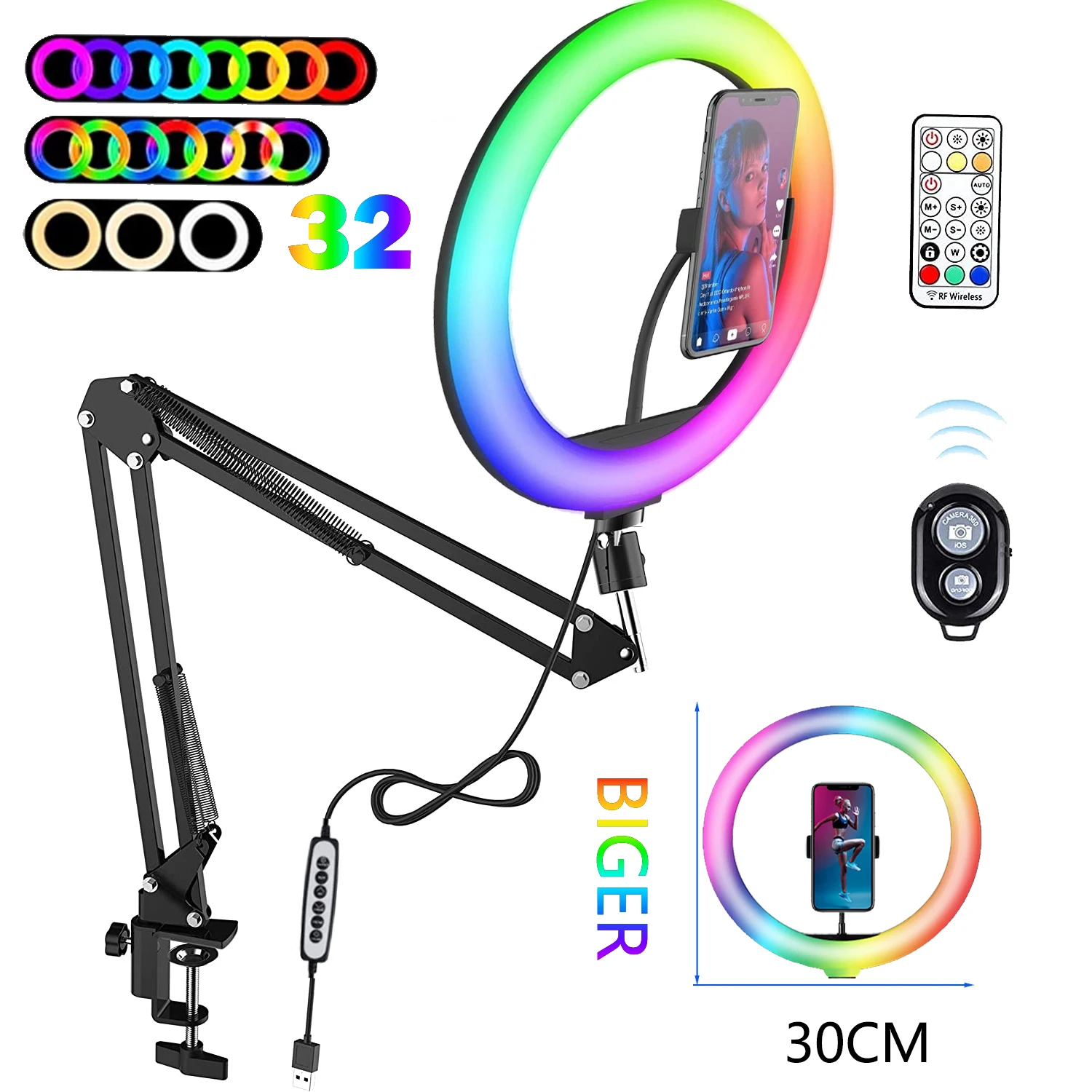 Кольцевой светильник для селфи, RGB, с длинной ручкой, для планшета, штатива, подставка для телефона, светодиодный светильник для телефона, для фотосъемки, ободок, светильник для съемки видео в реальном времени, макияж, круглая лампа