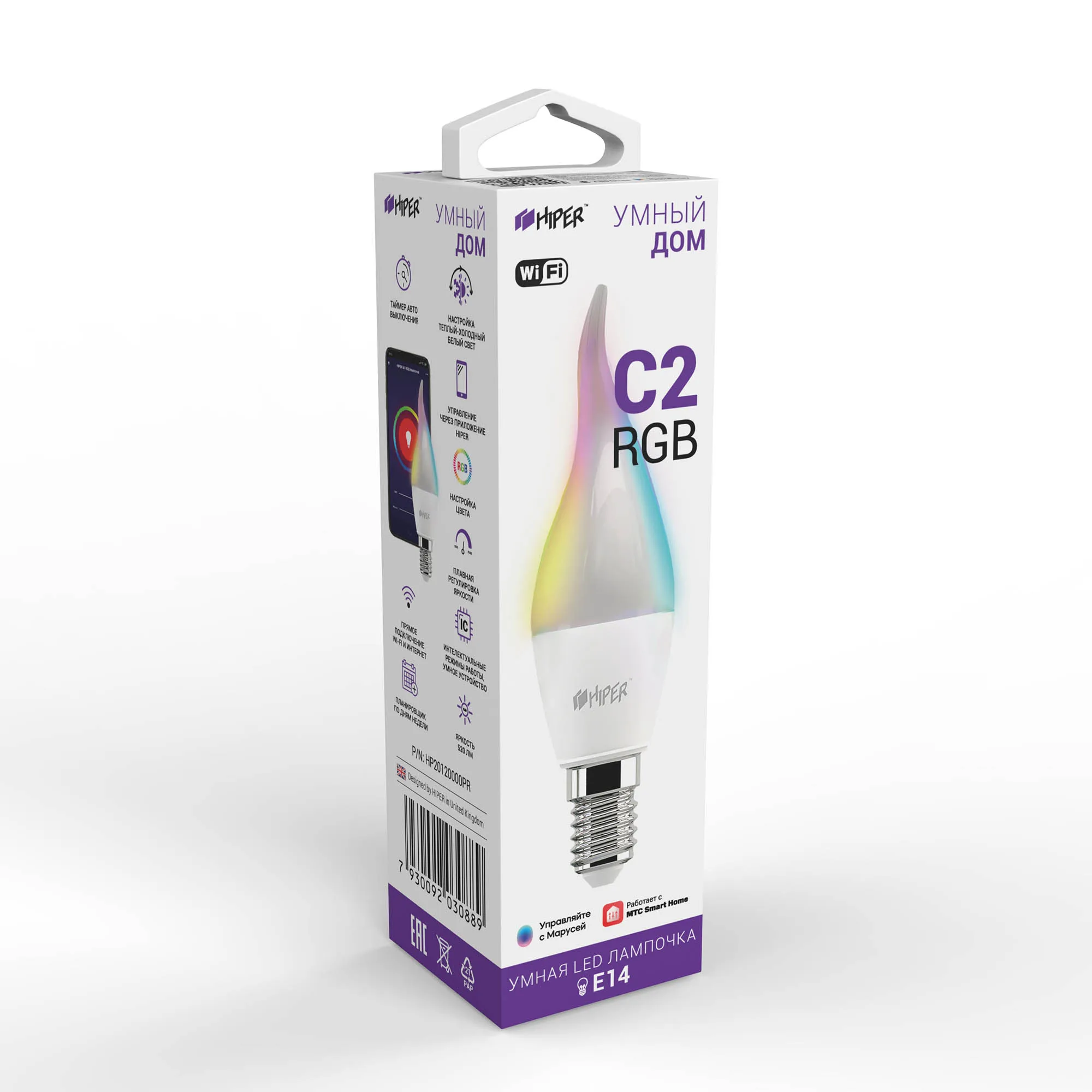 Умная светодиодная лампочка HIPER IoT LED C2 RGB в форме свечи CF37, поддерживает удаленное управление через приложение и предназначена для использования в любых устройствах для освещения со стандартным цоколем E14, расширяя их возможности.Меняйте температуру света, настраивайте комфортный теплый свет или контрастный холодный и выбирайте любой цвет свечения. Также вы можете настроить наиболее подходящий вам оттенок света лампы и регулировать яркость света придавая дополнительный уют вашему дому.HIPER IoT LED C2 RGB синхронизируется с вашей системой умного дома, работает независимо от других устройств и может быть объединена в группу через фирменное приложение HIPER IoT. Вы можете выбрать удобный способ управления с любого расстояния, нужно всего лишь подключить смартфон к Wi-Fi или использовать мобильный интернет для соединения с устройством.Контролируется через фирменное приложение HIPER IoT, доступное практически для всех смартфонов и планшетов, работающих на Android и iOS системах. Дружит с голосовыми помощниками: Алисой, Google, Siri, Марусей и другими.Качественные материалы и компоненты обеспечат безопасность и долговечность использования. Это отличная замена простым лампам. Поменяет ваше привычное понимание об освещении и поможет экономить на счетах за электроэнергию. HIPER IoT LED C2 RGB раскрасит серые будни в радужные цвета.Умная цветная LED лампочкаТип цоколя - E14Форм-фактор - Candle CF37Регулируемая яркость и цветРегулируемый белый свет 2700K - 6500KWi-Fi 2,4 ГГц, IEEE802.11b/g/nВход: AC 220-250В, 50/60 ГцПотребляемая мощность до 6 ВтСветовой поток до 520 lm