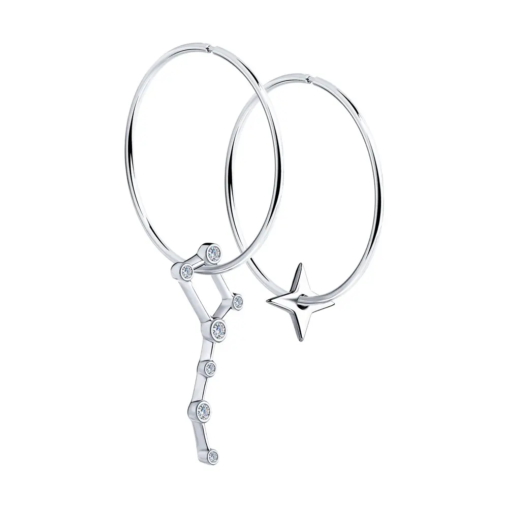 Серьги SKLV из серебра с фианитамиТы просто космос! Сияй безупречными образами вместе с украшениями вселенского дизайна. Эти стильные серебряные серьги-конго с фианитами, декорированные импровизированными созвездием «Большая медведица» и Полярной звездой, помогут выразить твою индивидуальность и загадать желания, которые непременно сбудутся.