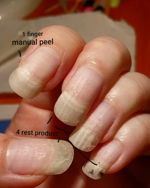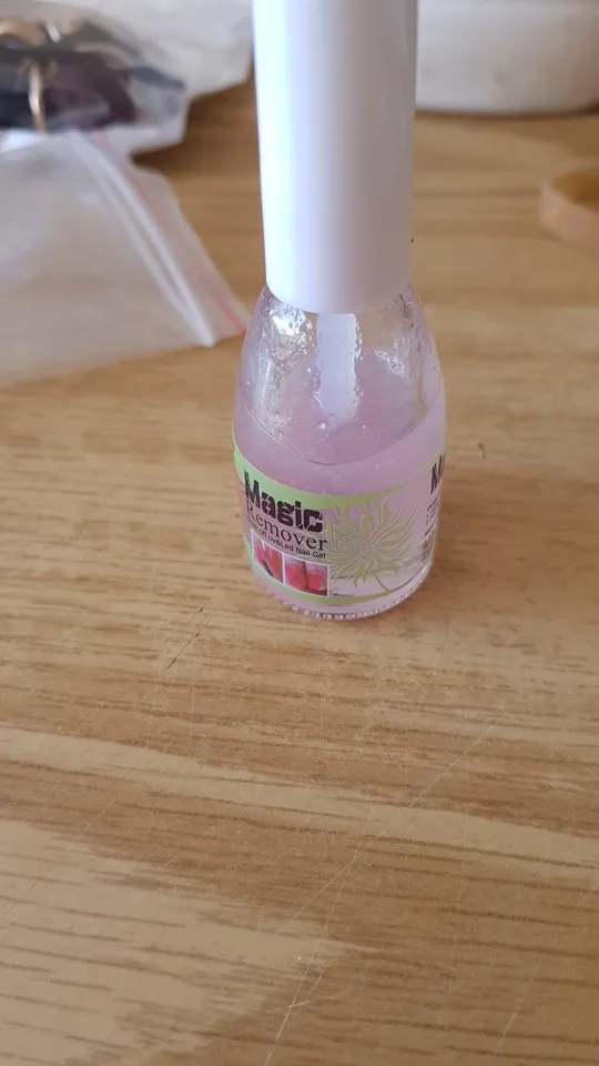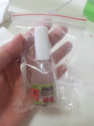 Это работает очень хорошо! Хороший продукт. Через 3-4 минуты вы можете удалить полупостоянную эмаль, используемую с помощью шпателя для кутикулы.