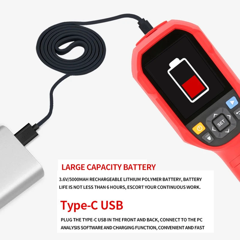 3,6 V / 5000MAH перезаряжаемые литий-полимерная батарея, время работы от аккумулятора составляет менее 6 часов, которые могут гарантировать вам непрерывной работы.Вставьте TYPE-C USB в переднюю и заднюю панель, подключите к программному обеспечению для анализа ПК и зарядите, что удобно и быстро