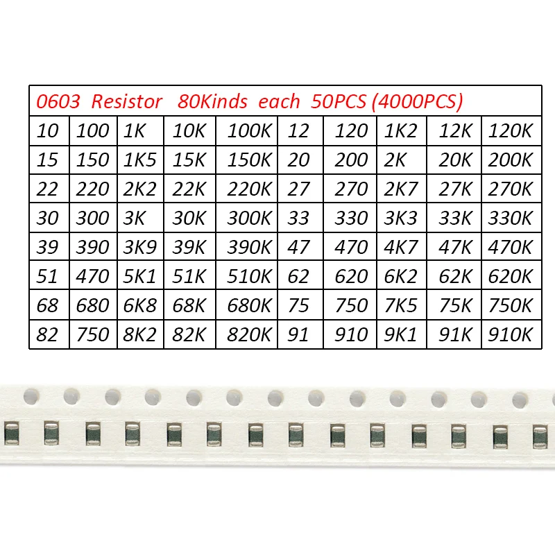 80 значений * 50 шт. = 4000 шт. набор резисторов 0603 5% SMD, набор резисторов 10R 910K