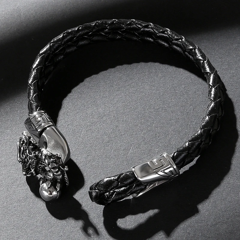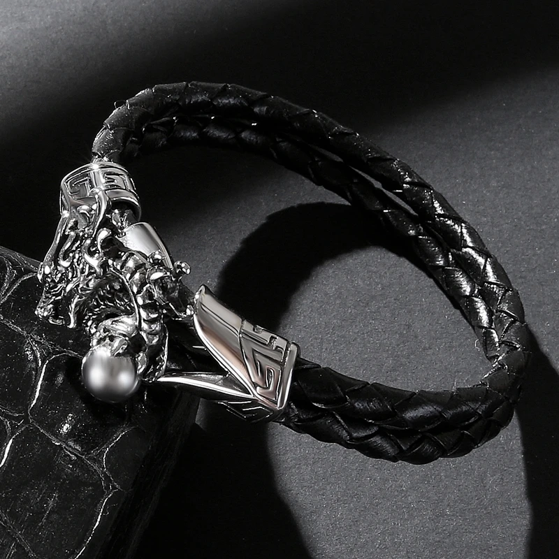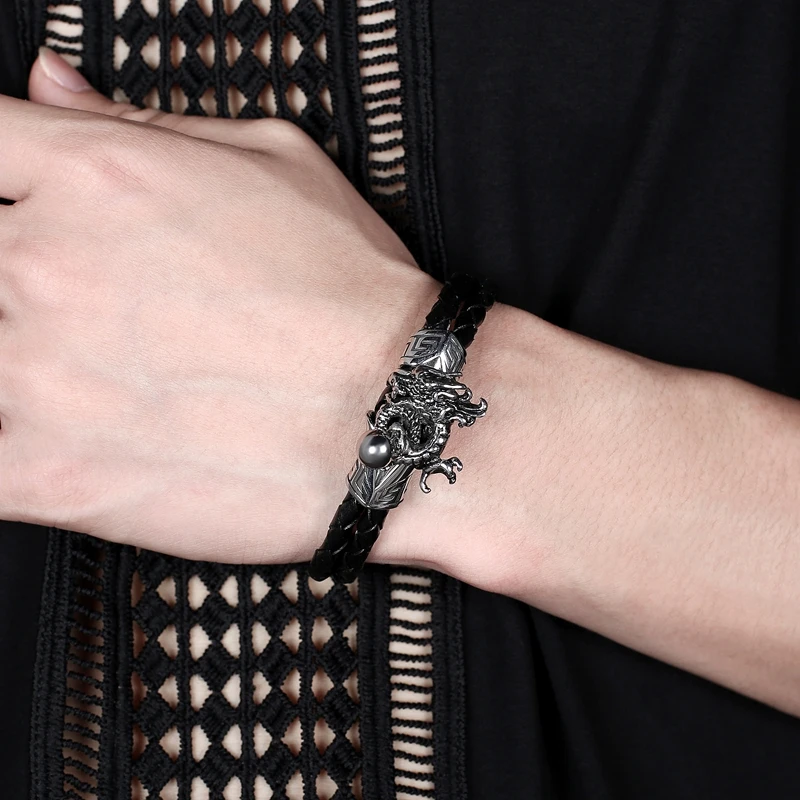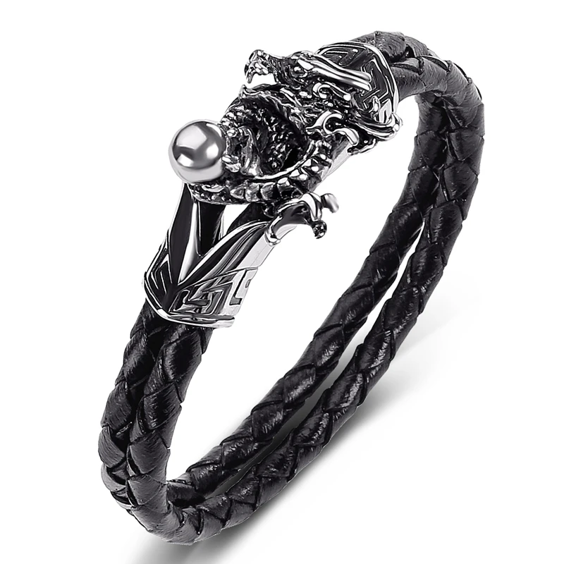 Двойной плетеный браслет из натуральной кожи мужской браслет из нержавеющей стали с драконом панк-рок ювелирные изделия ручной работы мужской браслет подарки P548