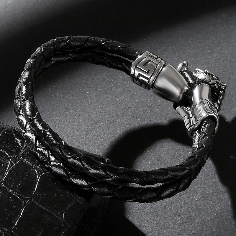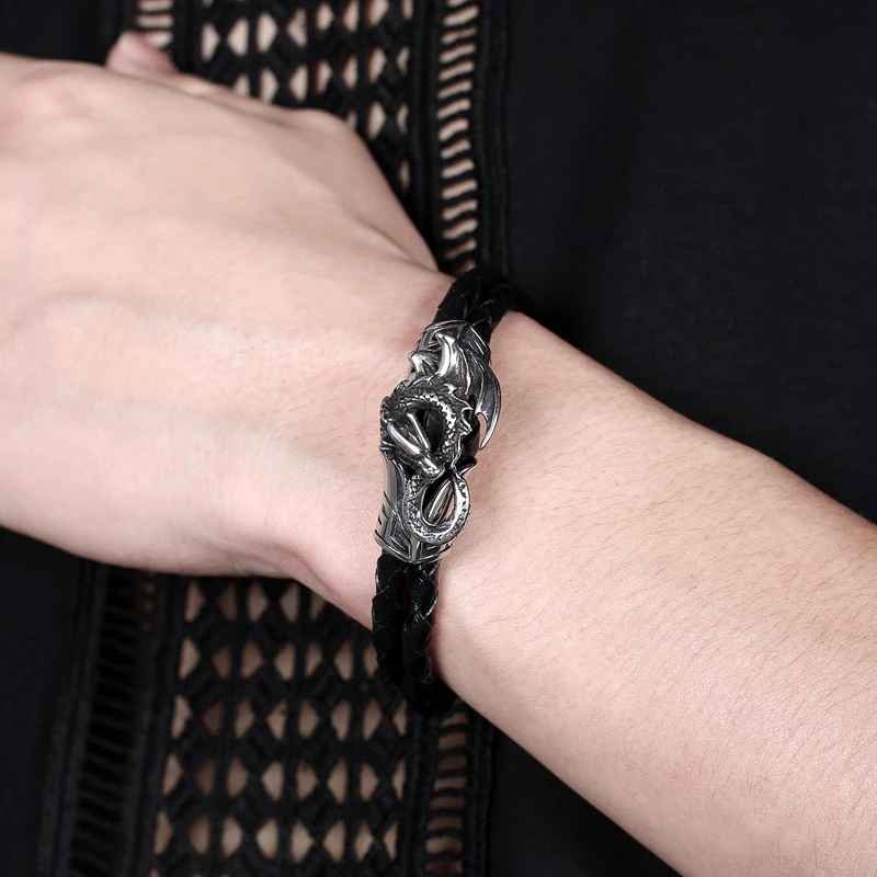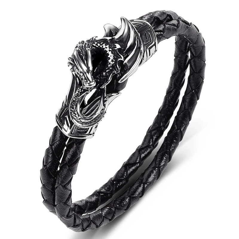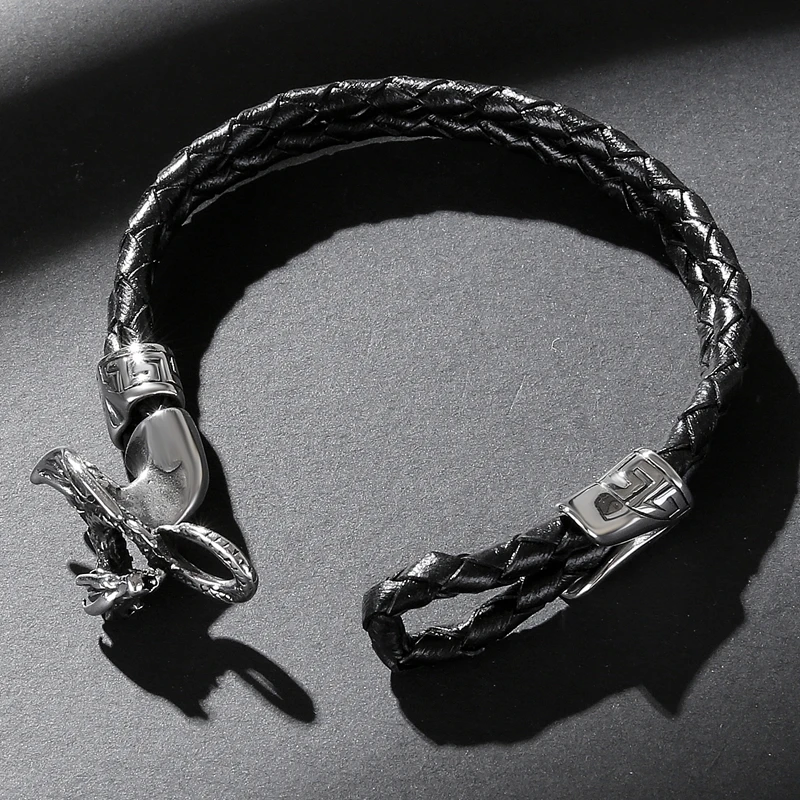 Браслет мужской из нержавеющей стали с двойной плетеной кожей, Ювелирное Украшение в стиле панк, хип-хоп, летающий дракон, подарок P549