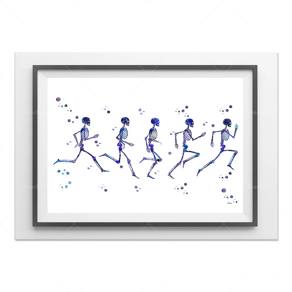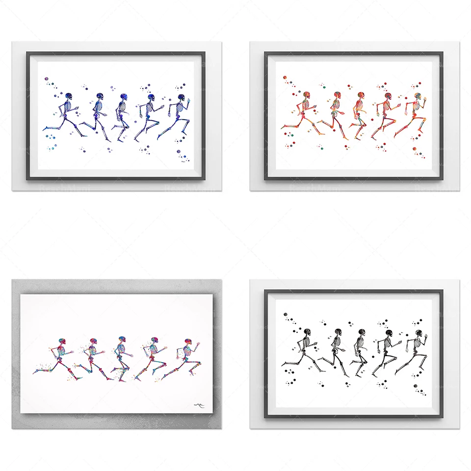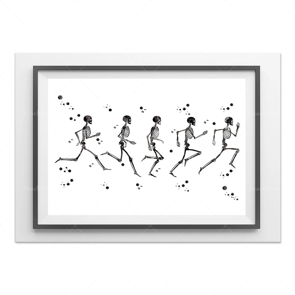 Фазы бега скелета Акварельная печать скелетная система плакат клиника физиотерапевт бегунок Спорт человеческие кости Анатомия медик