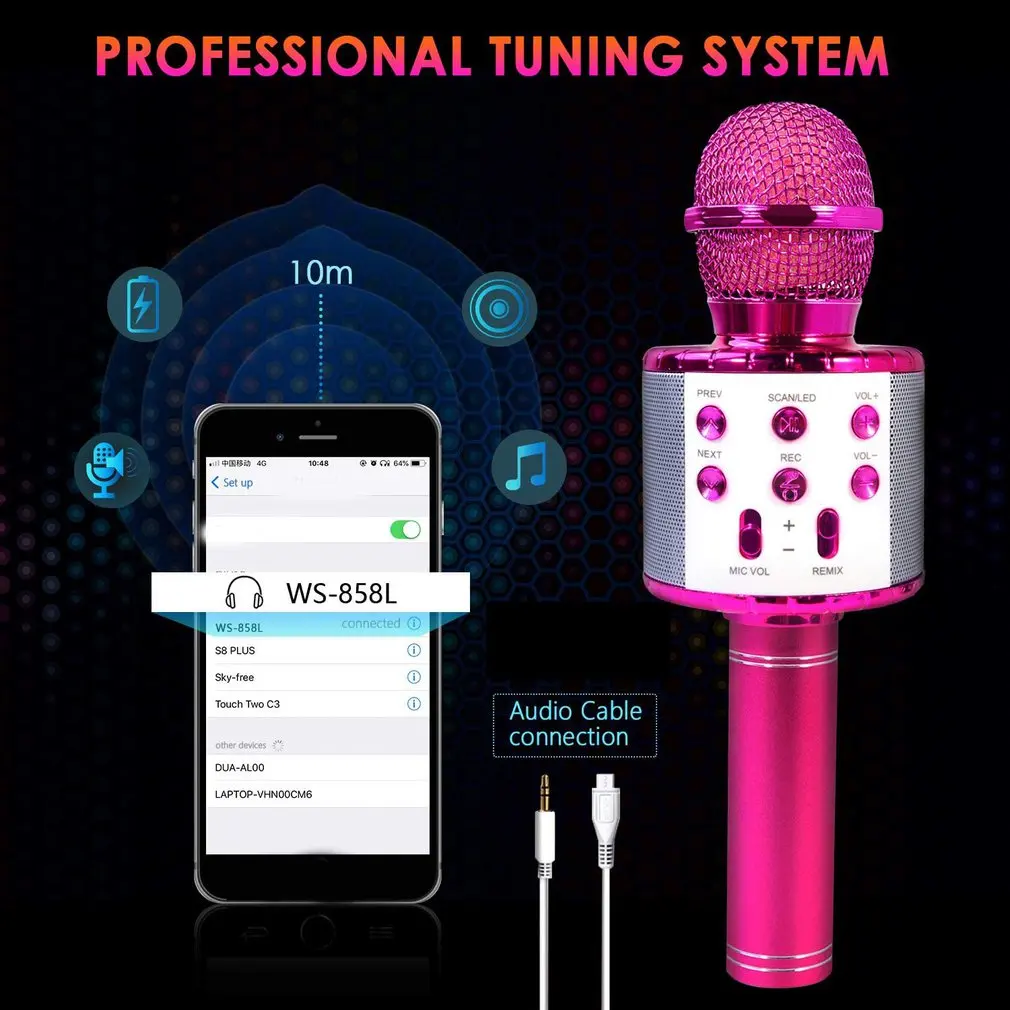 Особенности: 1. Беспроводная технология для снижения энергопотребления.2. Стабильное соединение и более быстрая скорость передачи, эффективное беспроводное рабочее расстояние до 10 м.3. Может подключаться к любым включенным смарт-устройствам.4. Использование: караоке-микрофон/диктофон/динамик/громкоговоритель.Описание:Это беспроводной портативный микрофон для караоке BKTV- WS858, Мультиплеер для караоке.Технические характеристики: модель товара: ws-858Вес продукта: 0,3 кгМощность динамика: 4Ω 3 ВтОтношение сигнал-шум: ≥ 85 дБДиапазон частотной характеристики: 150 ~ 20 кГцИнтерфейс источника звука: штекер стерео наушников 3,5 ммРазмер продукта: 22,5x7,6X7,6 смПосылка1 x беспроводной караоке-микрофон KTV(Включая батарею)Примечания:1. Из-за разницы между различными мониторами изображение может не отражать реальный цвет изделия. Мы гарантируем, что модель реального изделия не отличается от представленной на фото.2. Возможны незначительные различия в размерах из-за разных измерений вручную.