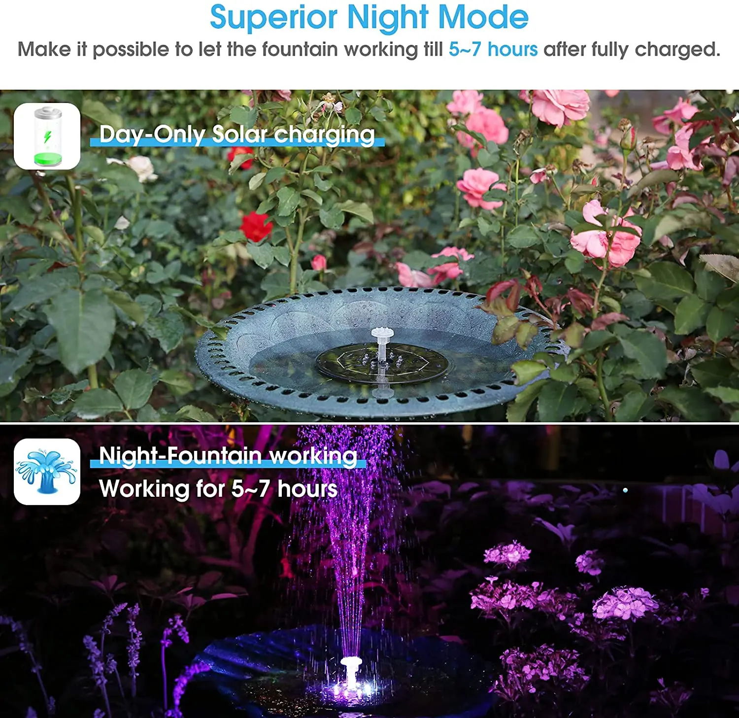 Этот солнечный насос очень подходит для птичьих ванн, аквариумов, небольших прудов, бассейнов, садов и циркуляции воды. Ваш огород обязательно привлечет внимание прохожих. Этот водяной насос на солнечной батарее делает ваш двор очень очаровательным.