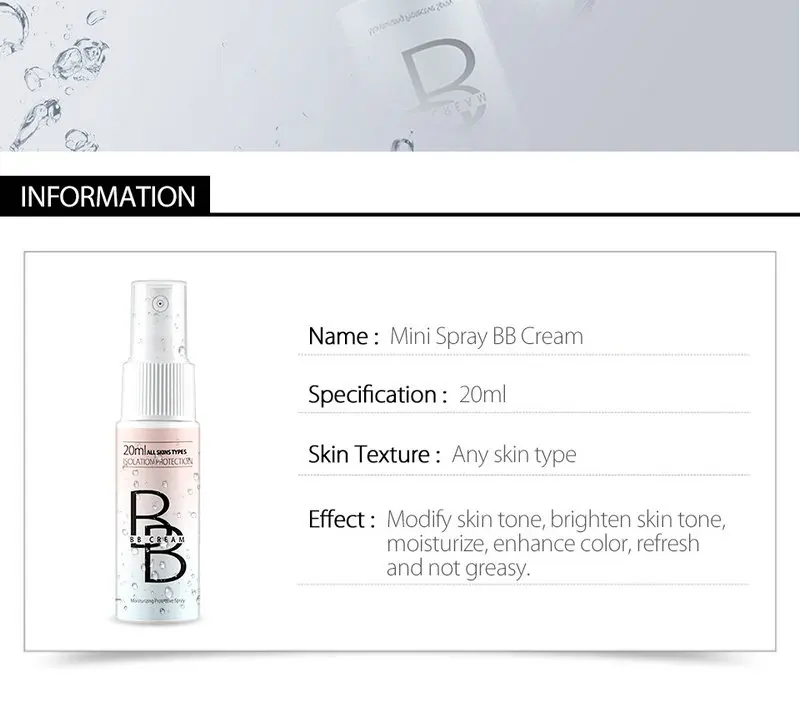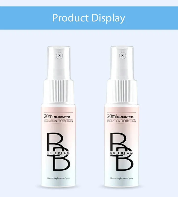 Особенности: Абсолютно новый и высококачественный Каждый раз дает вам безупречное нанесение основы. Отбеливание дефектов блока, длительное увлажнение, сдерживание нежной воды, увеличение блеска Обеспечивает безупречное покрытие, ощущая на коже совершенно невесомость и мягкость. Водостойкая, длительное ношение, Антивозрастная, увлажняющая, не вызывает раздражения, не закупоривает поры. Идеально подходит для всех типов кожи Новый Состояние спрей типа BB крем Посылка 1 x спрей BB-крем