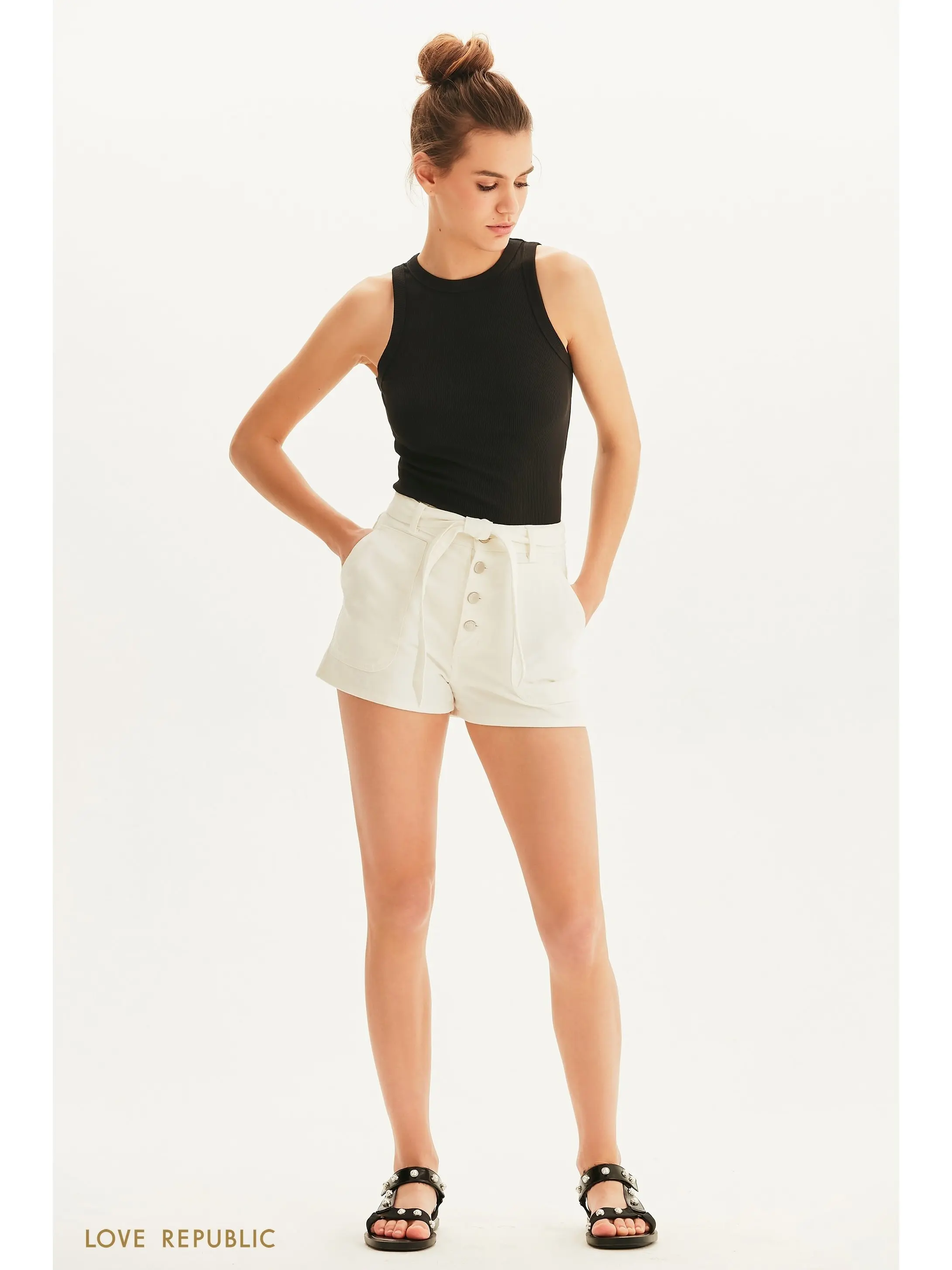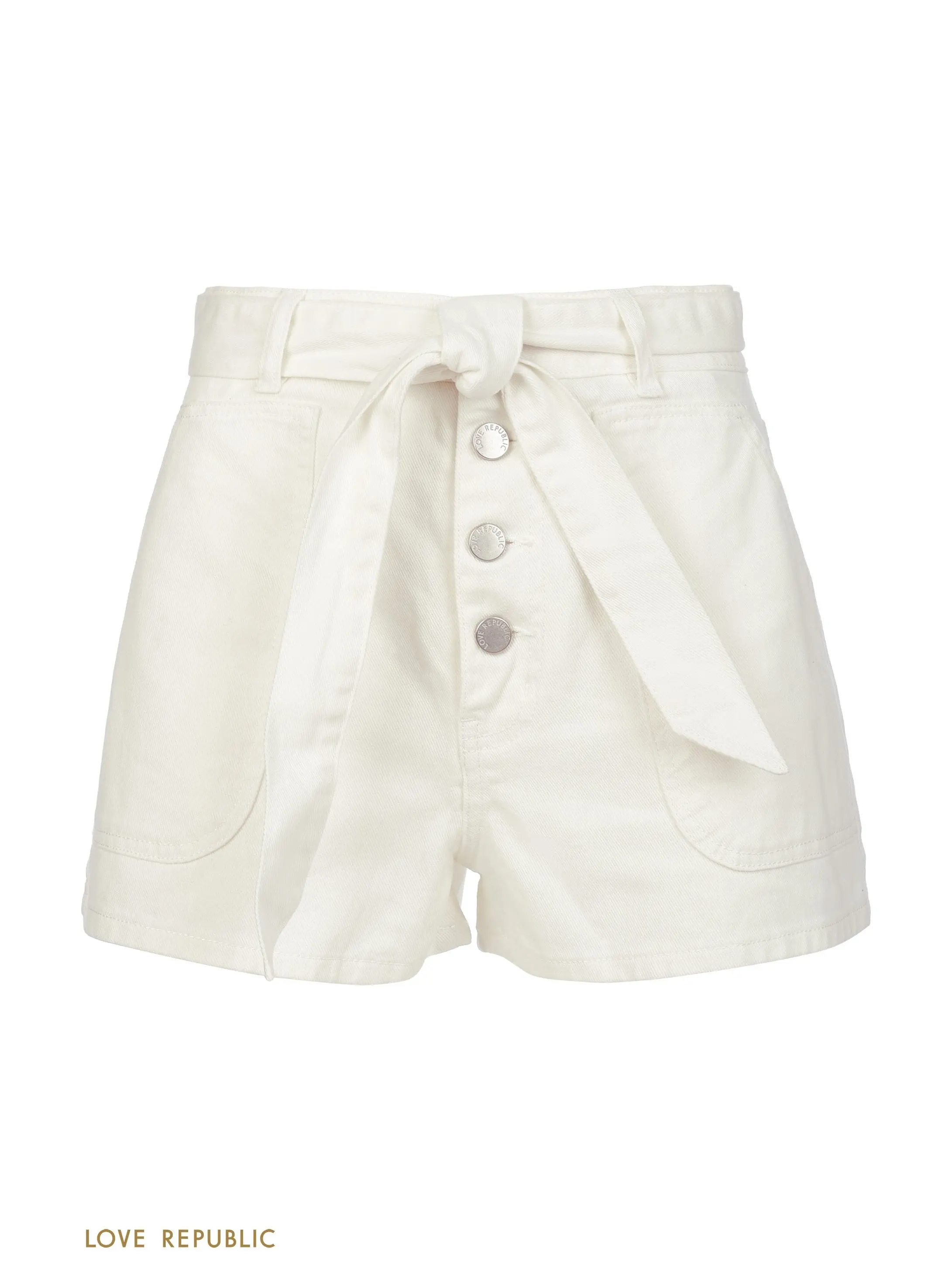Короткие джинсовые шорты в белом цвете. Большие накладные карманы по бокам, высокая посадка, съемный текстильный пояс. Модель застегивается на четыре пуговицы и молнию. Для стильного летнего образа сочетай шорты с кроп-топом и массивными аксессуарами. Крой модели соответствует стандартному размеру, обеспечивает идеальную посадку по фигуре. Размер на модели: 42.