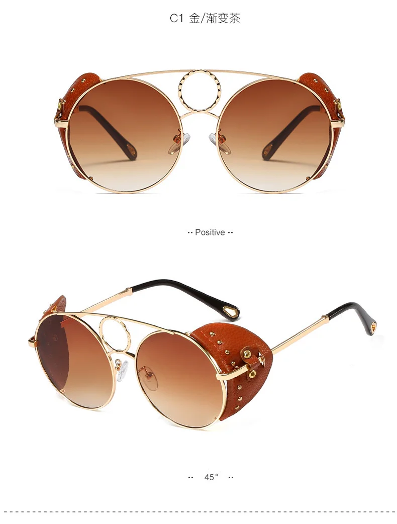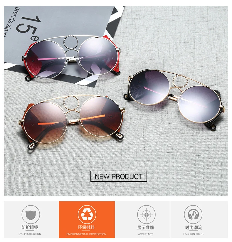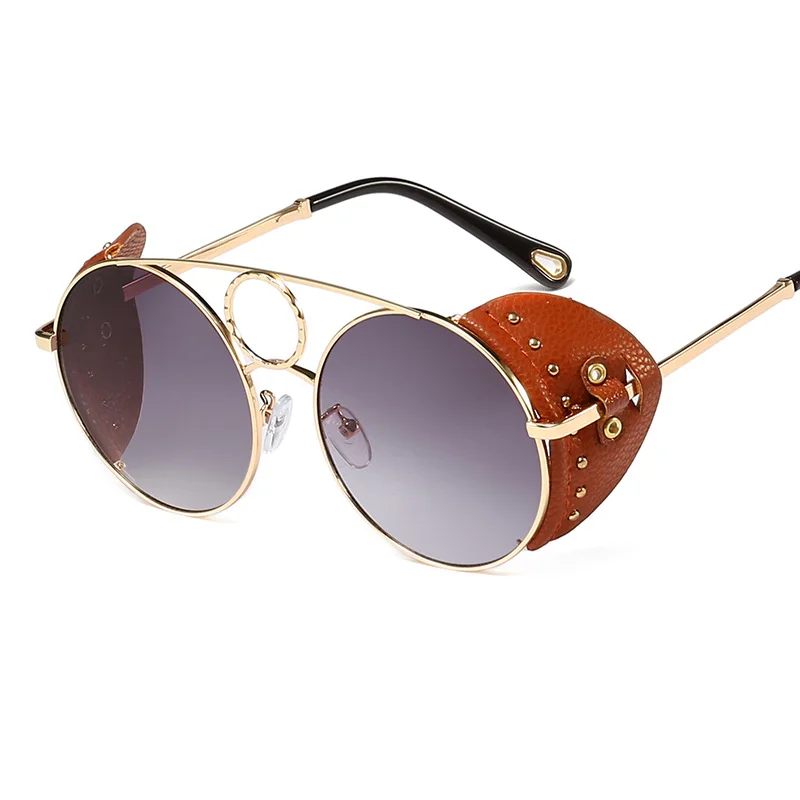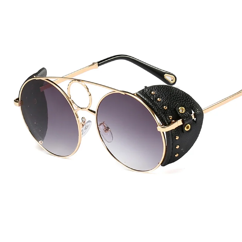 Бесплатная доставка Модные стимпанк Солнцезащитные очки в металлической оправе женские круглые солнцезащитные очки модные кожаные очки с заклепками для мужчин