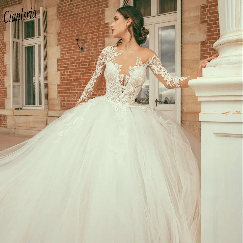 Свадебное платье с длинным рукавом, V-образным вырезом и цветочной аппликацией