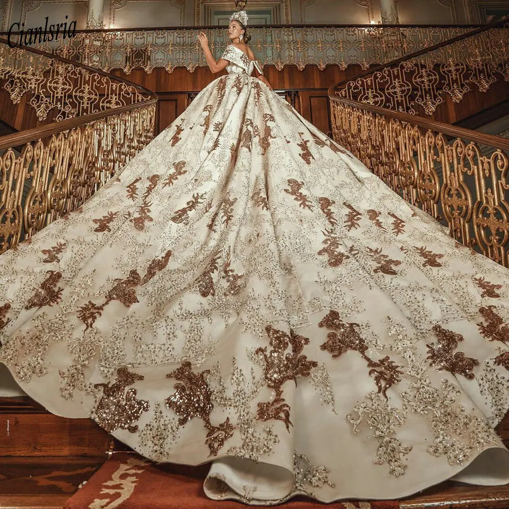 Роскошное платье с открытыми плечами и кристаллами со шлейфом в виде часовни, золотые блестки, Аппликации, Дубайский арабский бальный наряд, свадебное платье для невесты