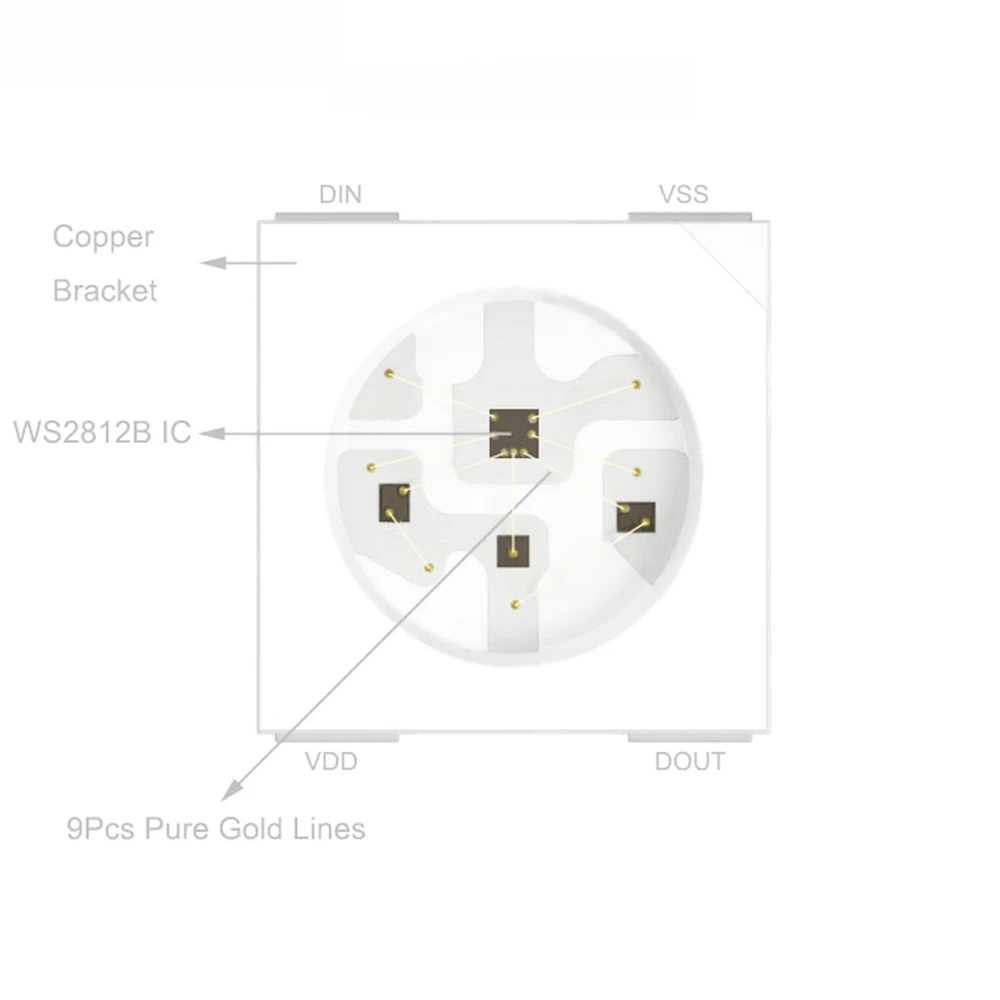 WS2812BЭто интеллектуальный светодиодный светильник управления, который интегрирован в посылка 5050 компонентов. Внутренняя система включает интеллектуальную цифровую защелку для передачи данных и схему усиления сигнала. Также включает прецизионный внутренний осциллятор и напряжение постоянного тока 5V машина для испытаний на программируемую постоянную ок Н-nt панель управления, эффективного пикселей точечный светильник цветного материала, украшенные последовательный свет.